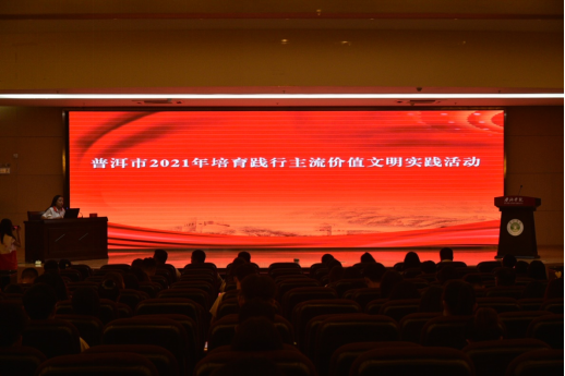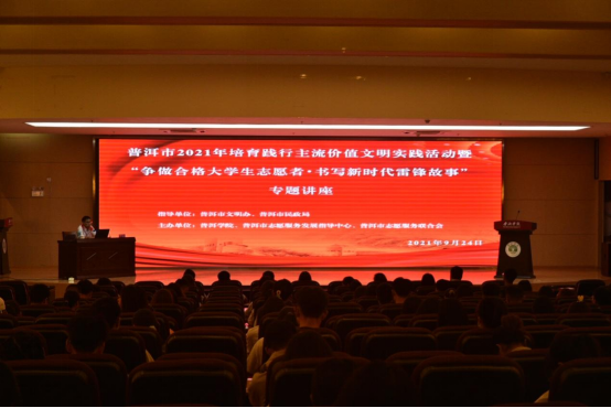 2021年9月24日晚上,由普洱市文明办、普洱市民政局指导,普洱学院、普洱市志愿服务发展指导中心、普洱市志愿服务联合会联合主办的“争做合格大学生志愿者•书写新时代雷锋故事”专题讲座在普洱学院图书馆学术报告厅举行。普洱学院团委副书记李祖昆主持讲座,普洱学院青年教师、团干部、志愿者代表,共200余人参加。