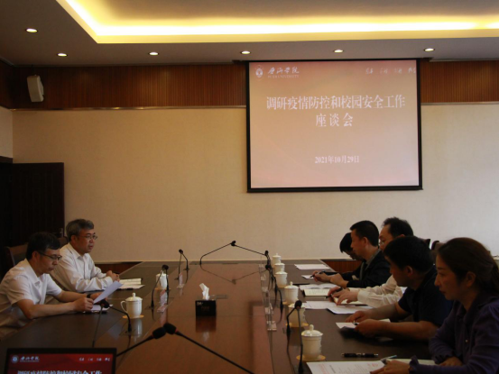 2021年10月29日,学校召开调研疫情防控和校园安全工作座谈会。党委副书记、校长马文会出席并讲话,党委委员、副校长白应华主持会议。会议强调,要深入学习贯彻习近平总书记关于新冠肺炎疫情防控工作的重要指示批示和讲话精神,认真落实中央和省委、省政府,以及市委、市政府决策部署,切实做好新冠肺炎疫情防控和校园安全管理工作,确保广大师生生命财产安全,维护学校和谐稳定。