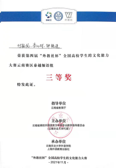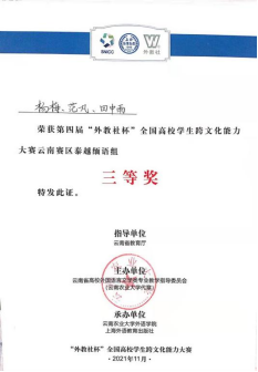 第四届“外教社杯”全国高校学生跨文化能力大赛云南赛区11月在云南农业大学举办。普洱学院东盟学院选送泰语组和缅甸语组各3名选手参赛,经过激烈的角逐,泰语组:付颖悦、李沁珂、钟艳连(指导教师:高梓烁、张佳)和缅甸语组:杨梅、范一凡、田中雨(指导教师:张素娇、张娅萍)6名同学荣获第四届“外教社杯”全国高校学生跨文化能力大赛云南赛区泰越缅语组三等奖。