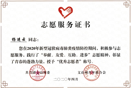 2020年1月疫情全面爆发,杨进云立即报名参加了文山州“青年防疫志愿者”,协助镇上的防疫工作。他跟随工作人员到各村宣传疫情防控知识,登记人员信息;在卡点驻守排查过往人员、车辆。每到赶集日,他要驻守进镇卡点,对来往车辆进行排查,劝阻群众折返;2021年,疫情进入常态化之后,杨进云地处边境一线的家乡文山州马关县成了严防境外疫情输入的重点区域,在做好自我防护的前提下,他积极做好宣传引导,用实际行动助力抗疫。因表现突出,他被共青团文山州委、州青年联合会授予抗疫“优秀志愿者”称号。