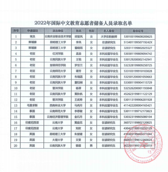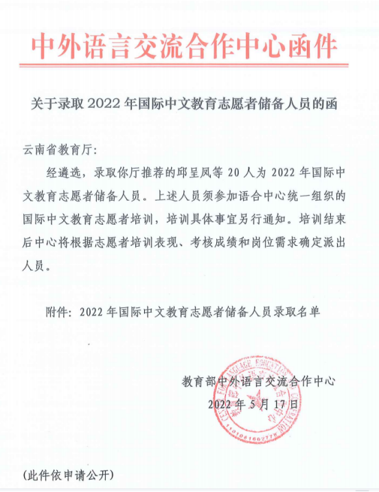 为支持国际中文教育发展,满足各国中文学习者的需要和海外教学机构对国际中文教育志愿者的需求,普洱学院根据教育部中外语言交流合作中心“国际中文教师志愿者项目”管理办法,组织开展2022年度国际中文教师志愿者项目志愿者招募工作,经教育部中外语言交流合作中心遴选,普洱学院2018级老挝语专业王武希和杨翠同学被录取为2022年国际中文教育志愿者储备人员。