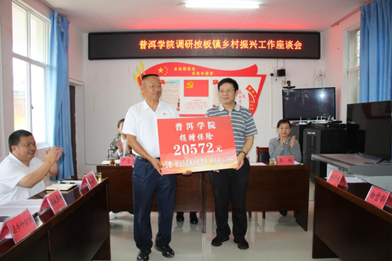 会后,普洱学院向联盟村捐赠防汛物资;向联盟村、磨庆村、宣河村动态监测户62户148人捐赠共计20572元人民普惠险医疗保险。