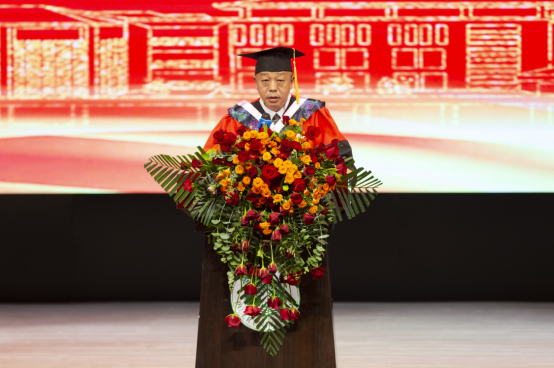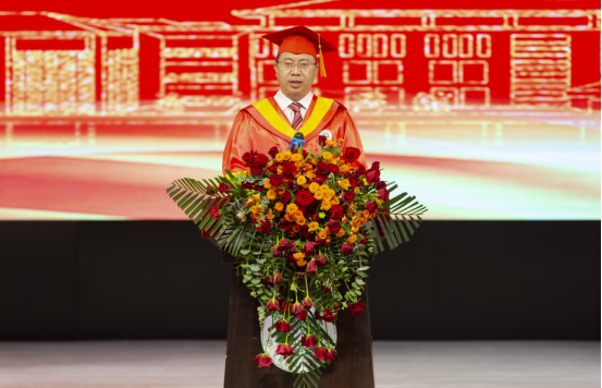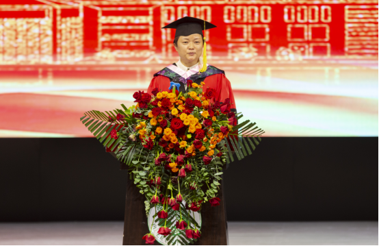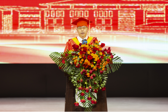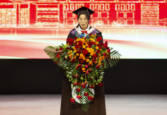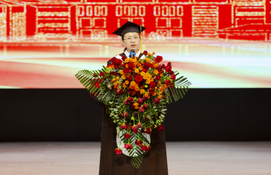 毕业生代表王俊燕回忆四年点滴后,对学校构筑的坚实平台和老师的辛勤培育表达了诚挚的感谢,并代表全体毕业生祝愿母校蒸蒸日上、欣欣向荣,祝愿老师们身体健康、桃李满园,祝愿毕业生们都能在自己选择的跑道上奋力前行,牢记时代赋予的责任与使命,始终以赤子之心回馈祖国和社会。