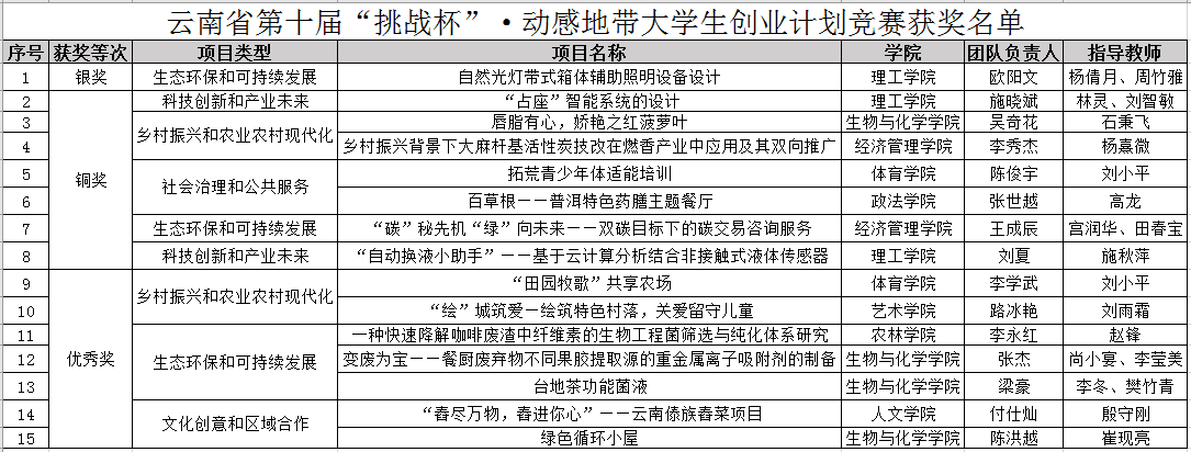 为深入学习贯彻习近平新时代中国特色社会主义思想和习近平总书记在庆祝中国共产主义青年团成立100周年大会上的重要讲话精神,贯彻落实国家双创工作部署,围绕立足新发展阶段、贯彻新发展理念、构建新发展格局、服务高质量发展,云南省第十届“挑战杯”·动感地带大学生创业计划竞赛开赛。我校推荐15个项目参加省级复赛,经过项目预审、省级初评、复评、终审决赛,最终,我校获得省级银奖1项、铜奖6项、优秀奖8项。