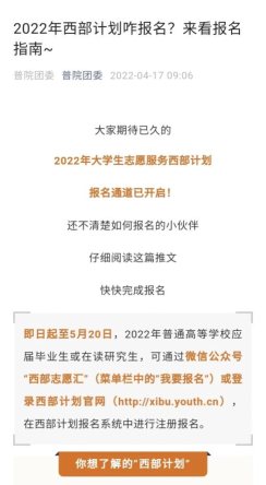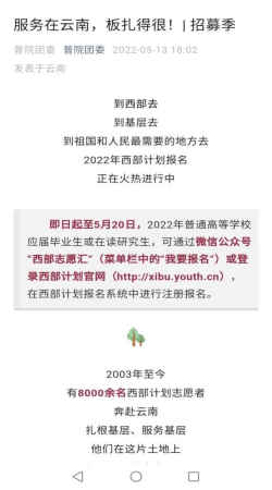 4-5月,西部计划宣传阶段,团委积极推进西部计划工作,将西部计划的报名流程、相关文件下发到学生手中,并且通过“普院团委”、“普洱学院团委官网”等新媒体平台发布西部计划相关推文,在学校公告栏上粘贴宣传海报等方式,让毕业生充分了解西部计划的相关政策、文件和招聘岗位信息。