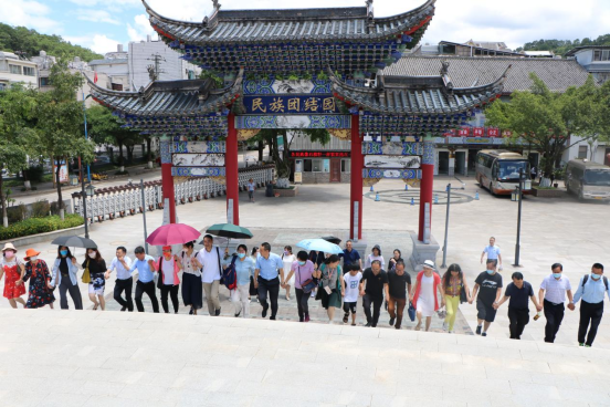 2022年7月22日,由云南省高等院校德育研究会、普洱学院主办,普洱学院马克思主义学院承办的“新时代高校立德树人”研讨会暨云南省高等院校德育研究会2022年学术年会组织开展实地研学活动。云南省高等院校德育研究会成员190余人现场考察参观了新中国民族团结第一碑——宁洱民族团结誓词碑,民族团结博物馆和全国民族团结示范村、全国文明村、中国乡村旅游模范村——那柯里村。