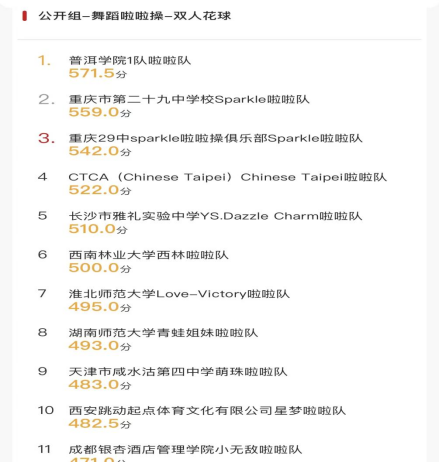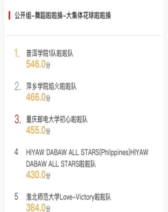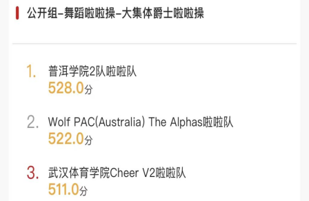 普洱学院此次共派出4支队伍参加比赛,最终,普洱学院男队以546获公开组大集体花球冠军(实现该项目三连冠),以571.5的全场最高分获双人花球项目冠军;普洱学院女队以6分优势战胜澳大利亚队首次获得公开组大集体爵士啦啦操冠军。