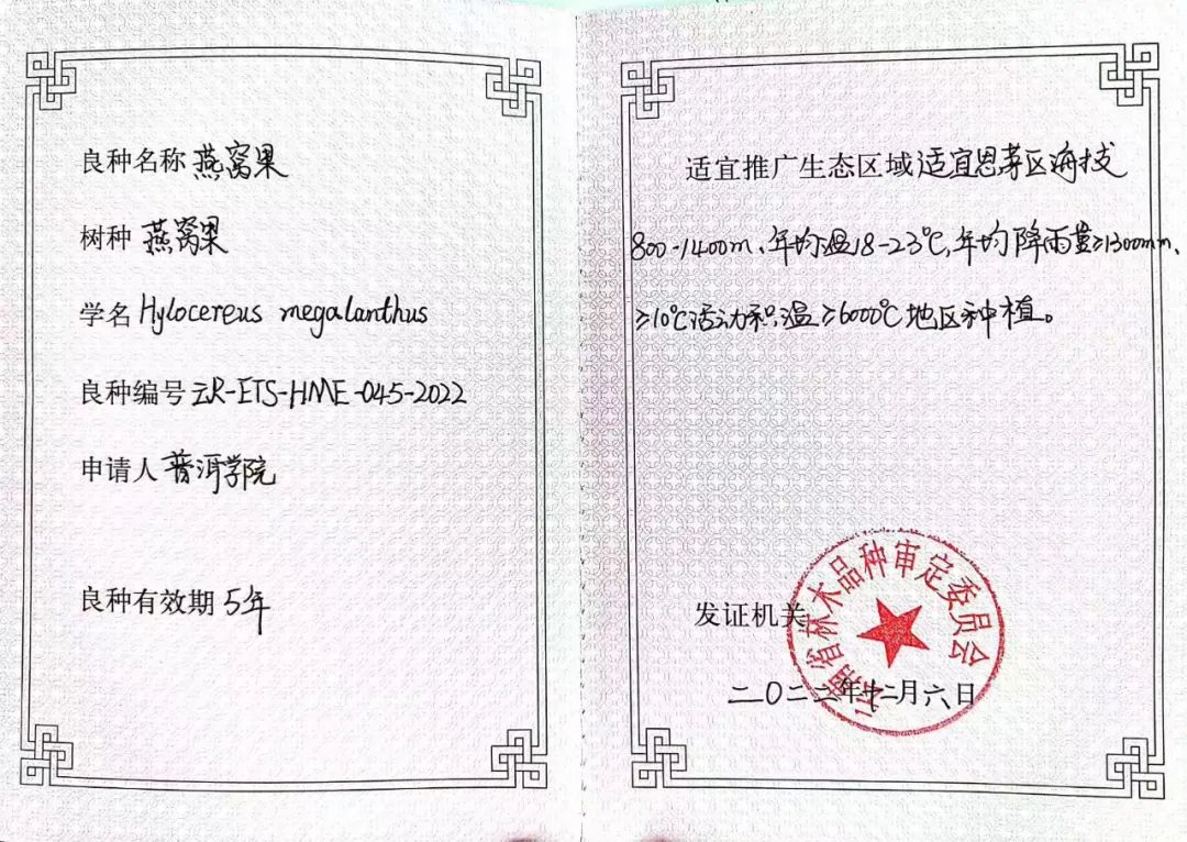 2023年1月28日,云南省林业和草原局发布2023年第5号《公告》,普洱学院茶叶咖啡学院徐玉梅老师主持选育的仙人掌科量天尺属植物“燕窝果”(又名麒麟果,良种编号:R-ETS-HME-045-2022)获得云南省林木品种审定委员会良种认定。该良种是我校徐玉梅老师继2021年主持选育认定“W4白柿”(又名冰淇淋果良种(良种编号:R-ETS-CE-038-2021)之后成功选育的第2个省级良种。燕窝果良种的成功认定,填补了我国仙人掌科量天尺属植物燕窝果(Hylocereus megalanthus)高价值水果良种的空白,对我省高价值水果种植、推广,提高单位面积的产量,丰富果品市场,增加农产品的经济效益具有重要意义。
