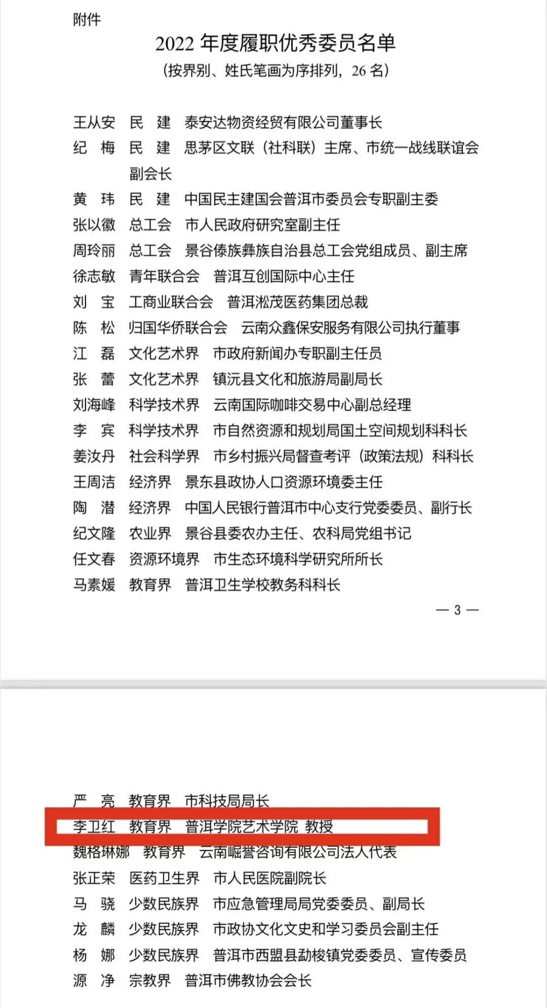 据《政协普洱市委员会关于表扬2022年度履职优秀委员的通报》,我校艺术学院教师李卫红作为2022年度履职优秀委员被通报表扬。