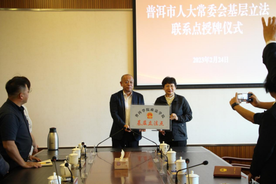2月24日,普洱市人大常委会基层立法联系点授牌仪式在普洱学院和谐楼一楼会议室举行。普洱市人大常委会党组副书记、副主任李鸿,普洱学院党委委员、党委副书记李险峰出席仪式并讲话。