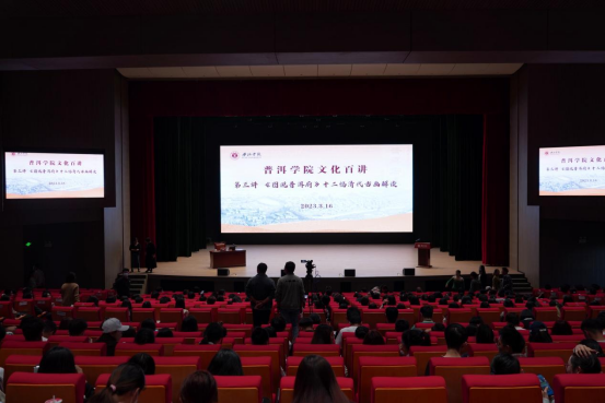 3月16日,普洱学院“文化百讲”第三讲“《图说普洱》——十二幅清代古画解读”在演播厅精彩开讲。本次讲座邀请到市委党校原市情研究室教授、茶城银发文化顾问专家团团长黄雁主讲。党政班子领导成员出席,党委委员、马克思主义学院党支部书记杨萍主持。全校师生700余人参加讲座。