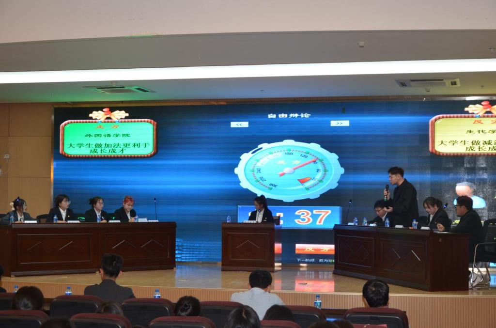 本次辩论赛分为初赛、复赛以及决赛三个阶段。经过初赛、复赛层层角逐,最终政法学院、人文学院、生化学院、外国语学院4支代表队脱颖而出进入决赛。辩手们在赛场上围绕“大学生做加法还是减法更有利成长成才”这一辩题,展开了激烈辩论。