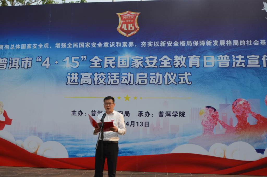 在第八个全民国家安全教育日来临之际,4月13日,普洱市“4·15全民国家安全教育日”普法宣传进高校活动启动仪式在普洱学院举行,启动仪式由普洱市公安局和普洱学院共同举办。普洱学院党委副书记李险锋,普洱市委副秘书长、市公安局党委副书记、常务副局长徐伟出席并讲话,普洱学院党委委员、副院长田洋主持,市、区两级公安机关相关部门负责人和普洱学院各部门、二级学院主要负责人、辅导员及部分民警、学生代表参加本次活动。