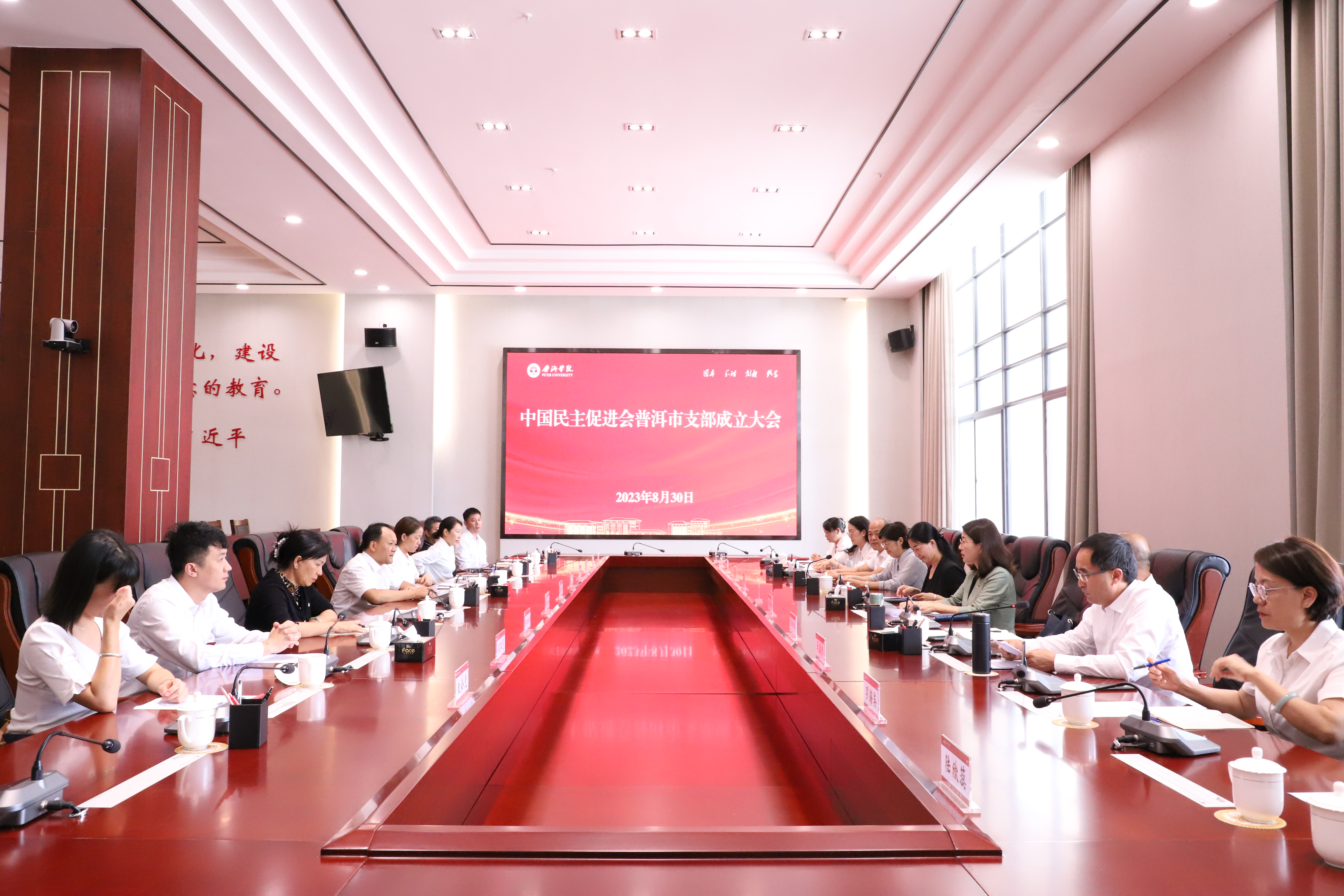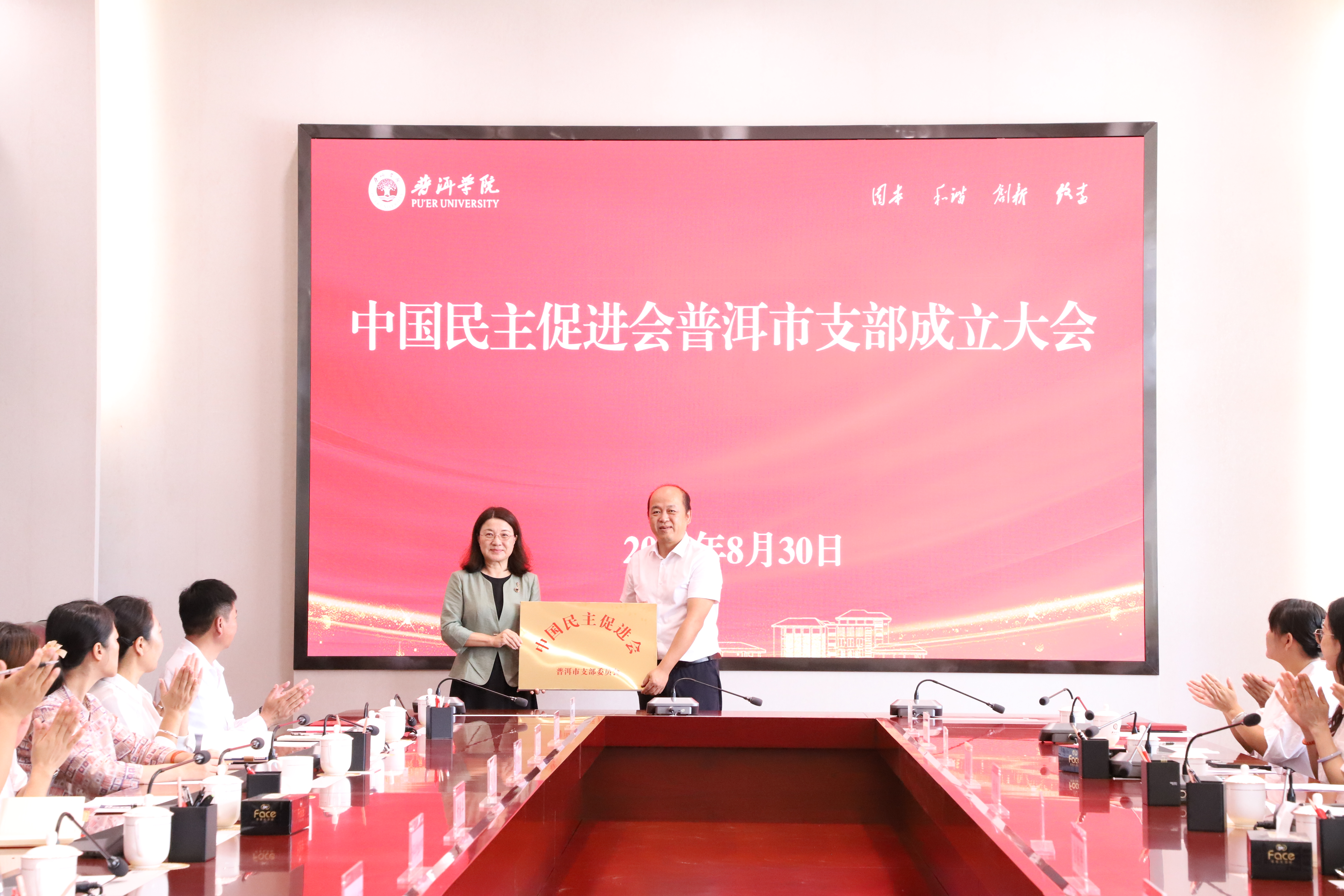 8月30日下午,中国民主促进会普洱市支部成立大会在普洱学院举行。云南省政协副秘书长、民进云南省委会专职副主委金振辉,中共普洱市委常委、市委统战部部长段冬梅,普洱市政协副主席、九三学社普洱市基层委员会主任委员黄鹤出席会议并讲话。中共普洱学院党委副书记李险峰,普洱学院副院长陈勇出席会议。民进云南省委会秘书长马孟杰主持会议。