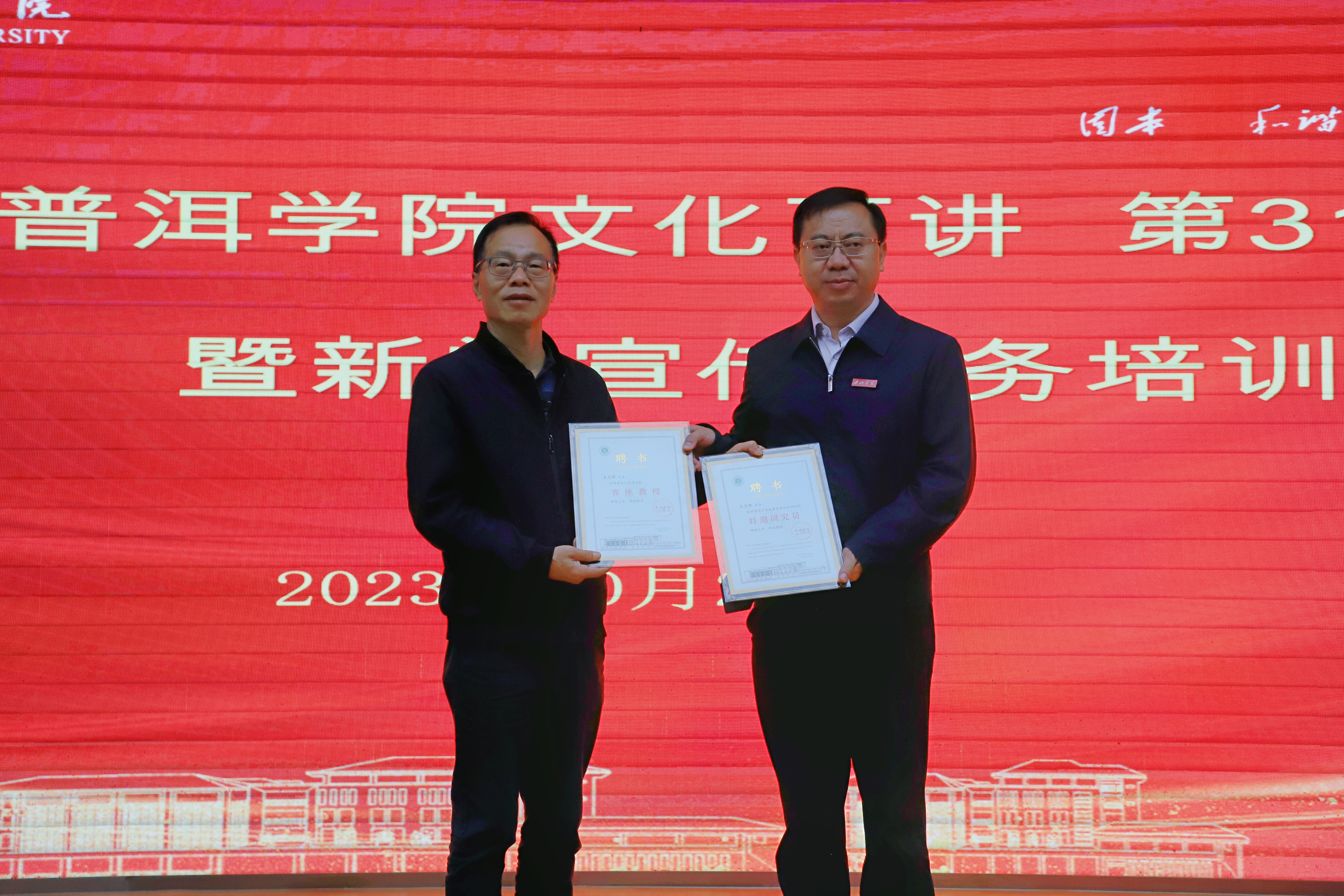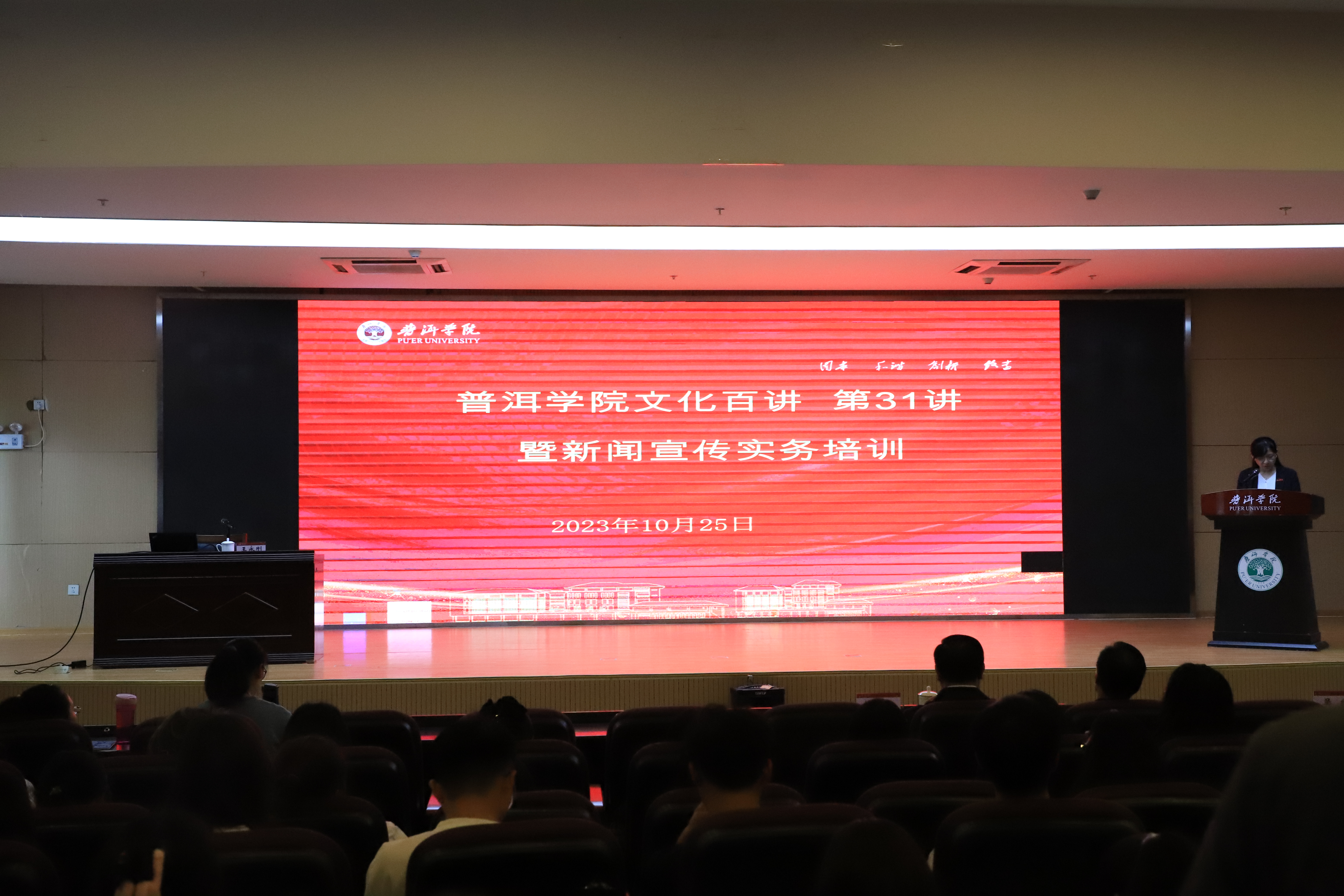 10月25日,普洱学院举行文化百讲第三十一讲,邀请云南日报社编委、二级高级记者、云南文化名家王永刚开展题为《舆论引导能力与新闻采编要领》的专题讲座并作新闻宣传实务培训。普洱学院党委书记胡国云出席活动并向王永刚老师颁发“普洱学院客座教授”和“普洱学院普洱茶文化研究院特邀研究员”聘书,党委副书记吴琳主持讲座。各部门、二级学院从事新闻宣传工作的负责人,全体新闻宣传通讯员及各二级学院学生宣传骨干,学校新媒体中心全体成员到场参加培训。