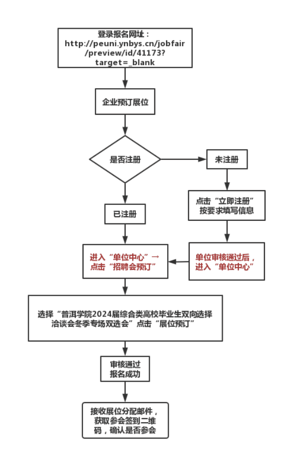 (一)本次活动采用线上报名。请各参会单位于2023年11月30日前登录普洱学院就业信息网(http://peuni.ynbys.cn/)进行注册,注册完成后点击“普洱学院2024届综合类高校毕业生双向选择洽谈会(冬季专场)”进行报名,报名流程详情见附件2。