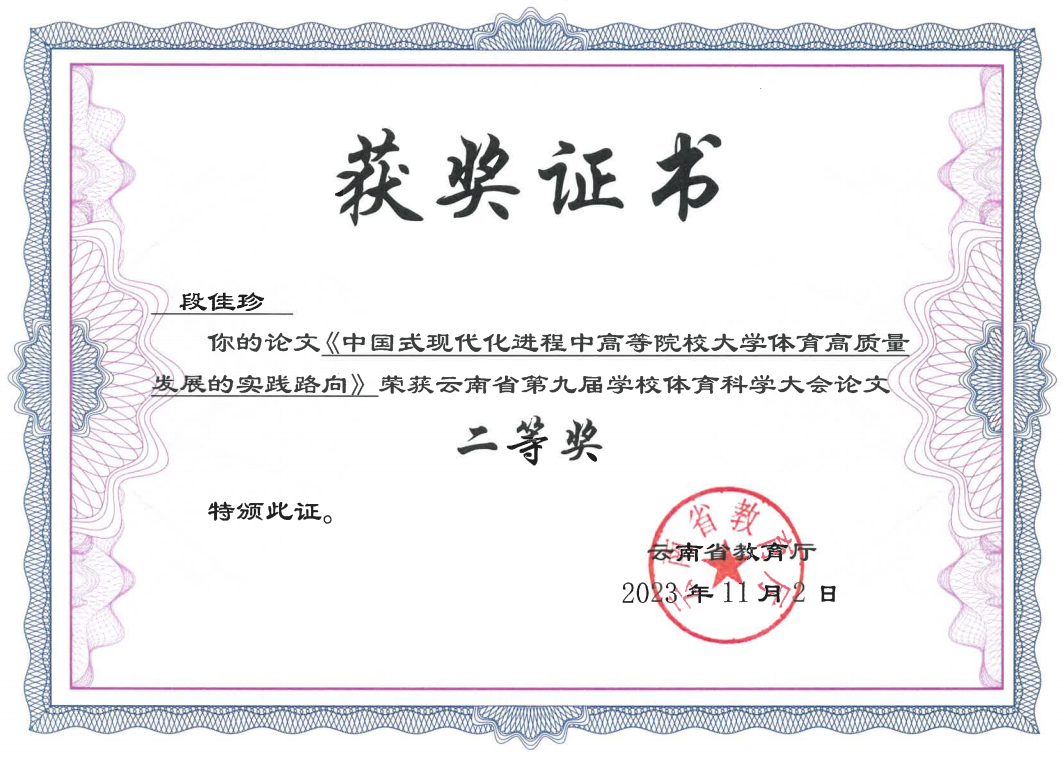 11月1日,云南省2023年第九届学校体育科学论文报告会评选结束,报告会一共征集1200余篇论文,评选出237篇获奖论文。其中我校体育学院段佳珍老师的《中国式现代化进程中高等院校大学体育高质量发展的实践路向》论文荣获二等奖。