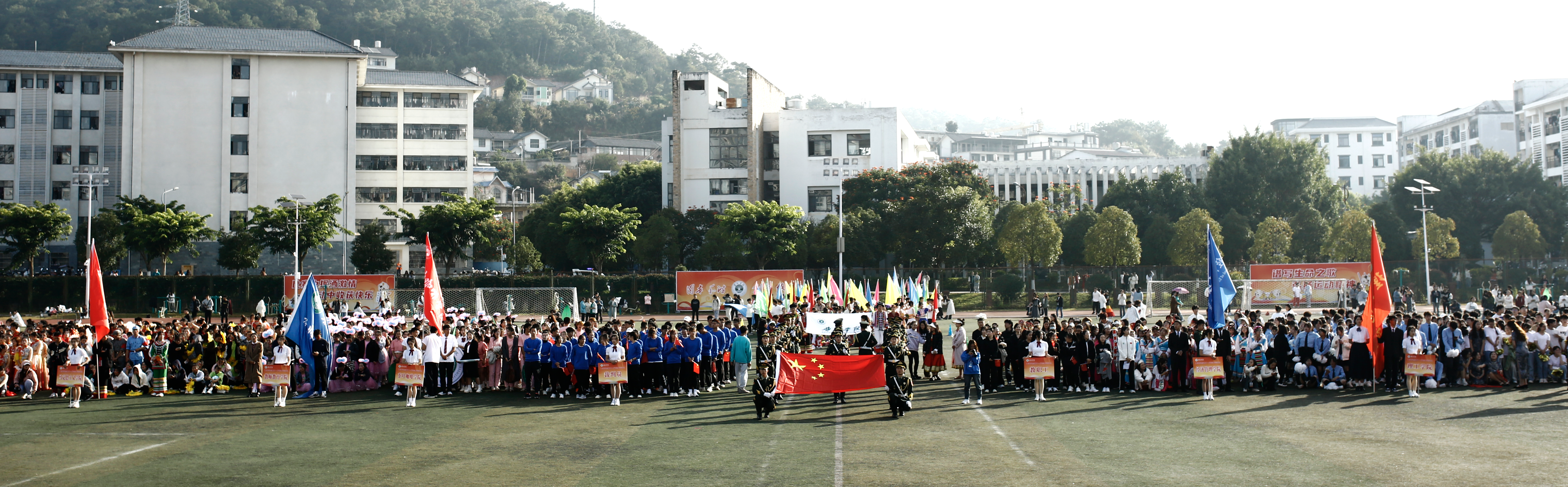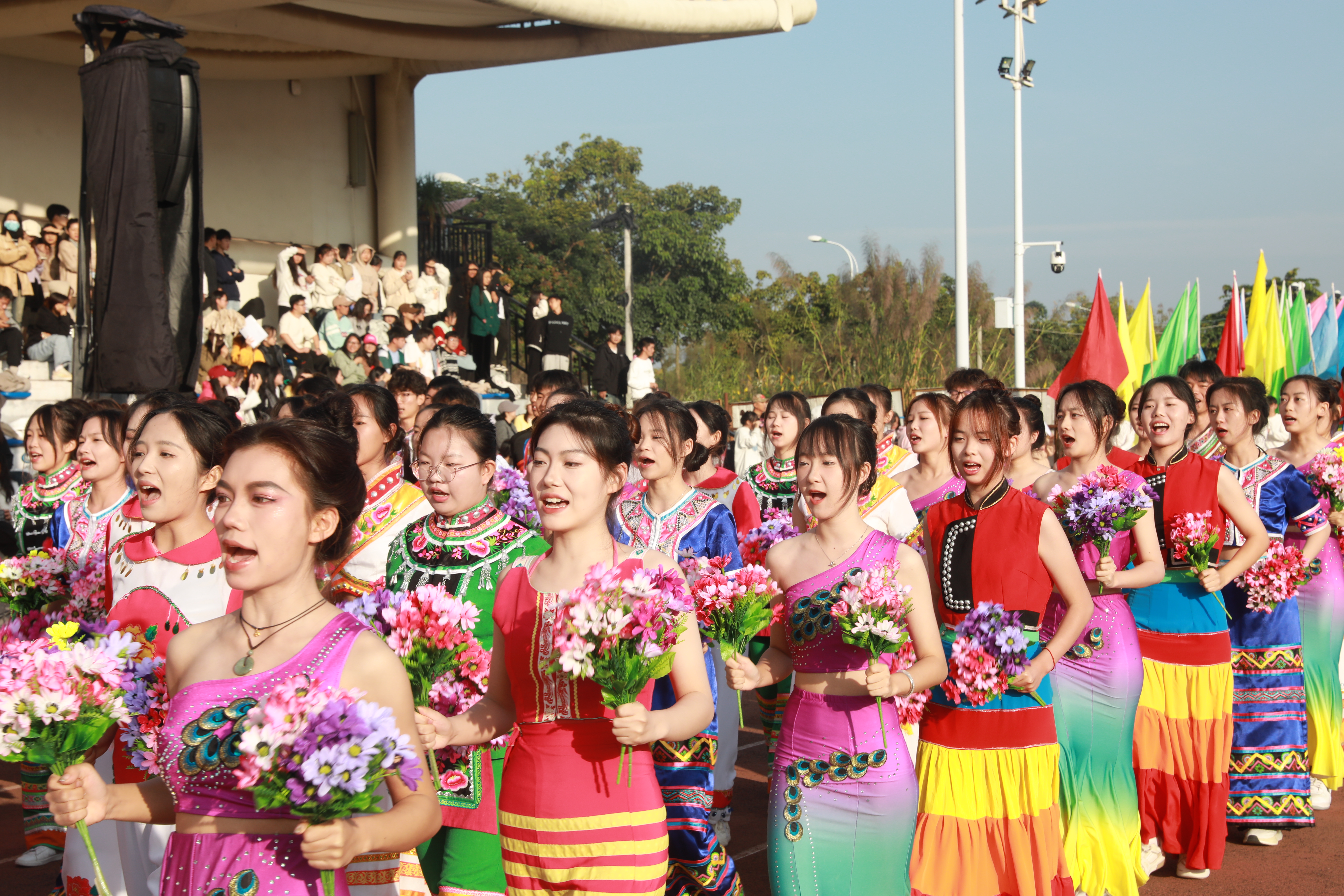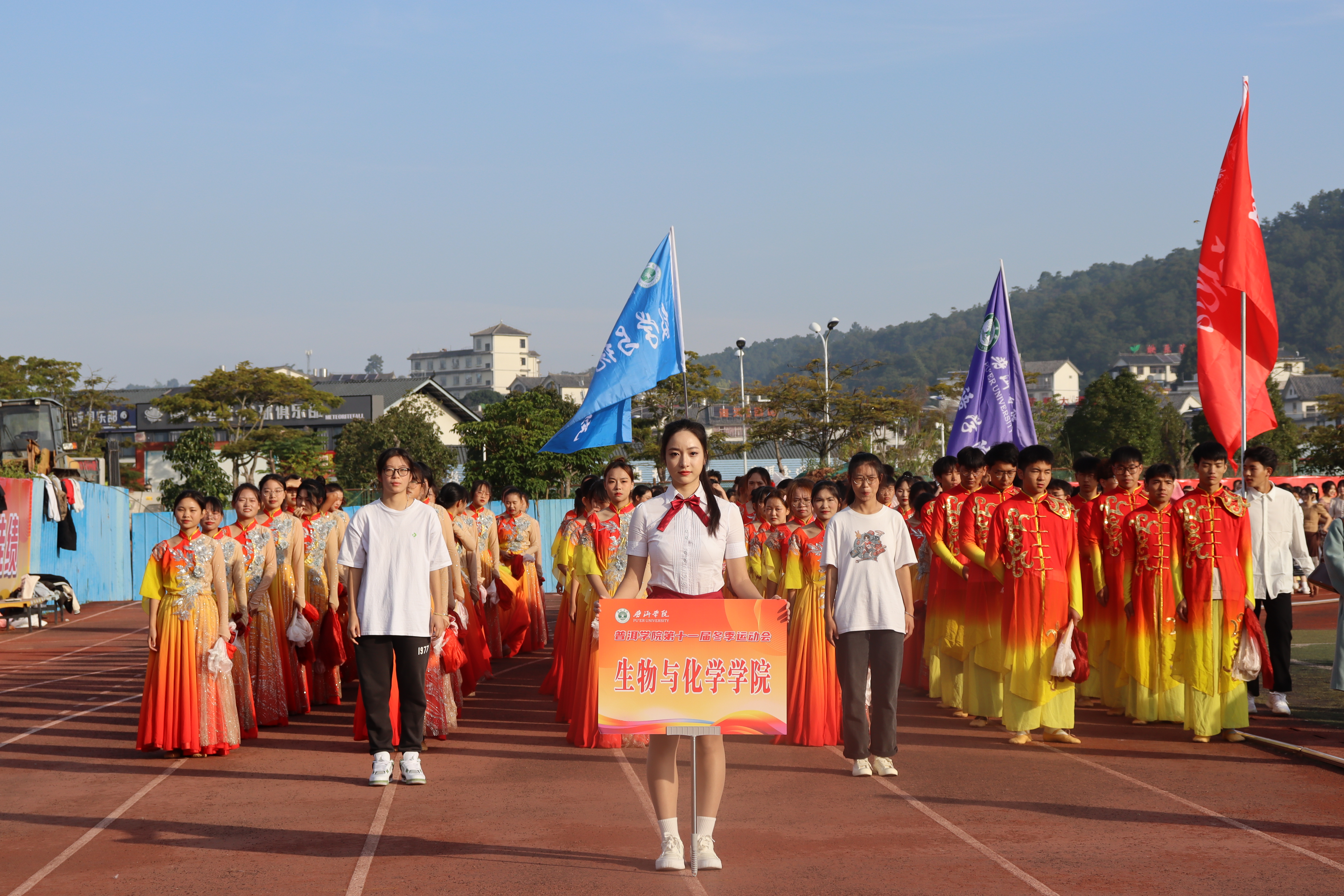 雄赳赳、气昂昂的彩旗队,五颜六色的旗帜迎风飘扬,喜庆而热烈,它们象征着我们开拓创新的精神面貌,更象征着普洱学院的勃勃生机。