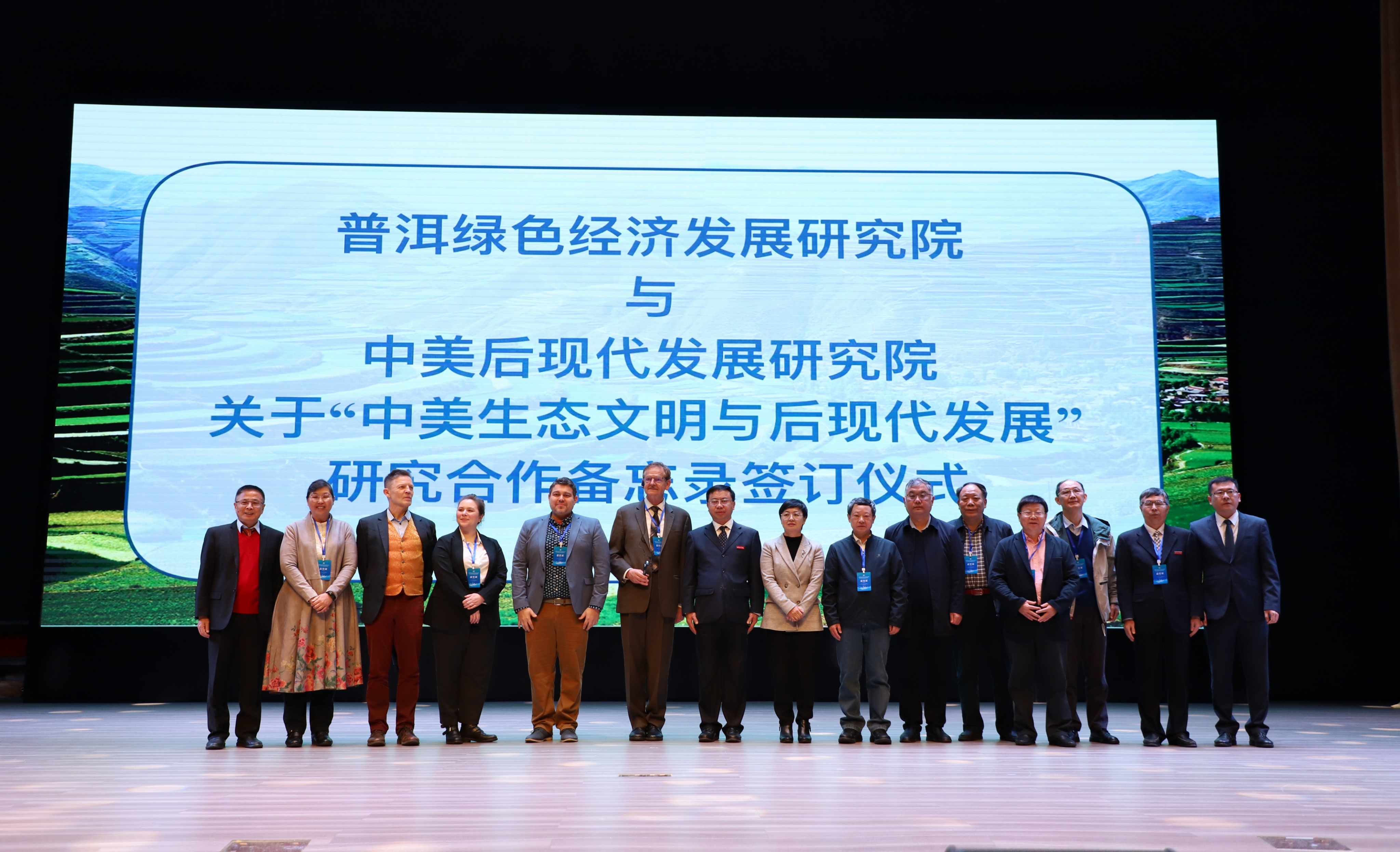 菲利普•克莱顿与田洋分别代表中美后现代发展研究院与普洱绿色经济发展研究院签订“中美生态文明与后现代发展”研究合作备忘录,安德鲁•施瓦兹、阿提拉·格兰德皮埃尔、柯琳·胡梅尔、温秀枝、王治河、胡国云、马文会、别燕妮、李江涛、张林、徐寒共同见证。