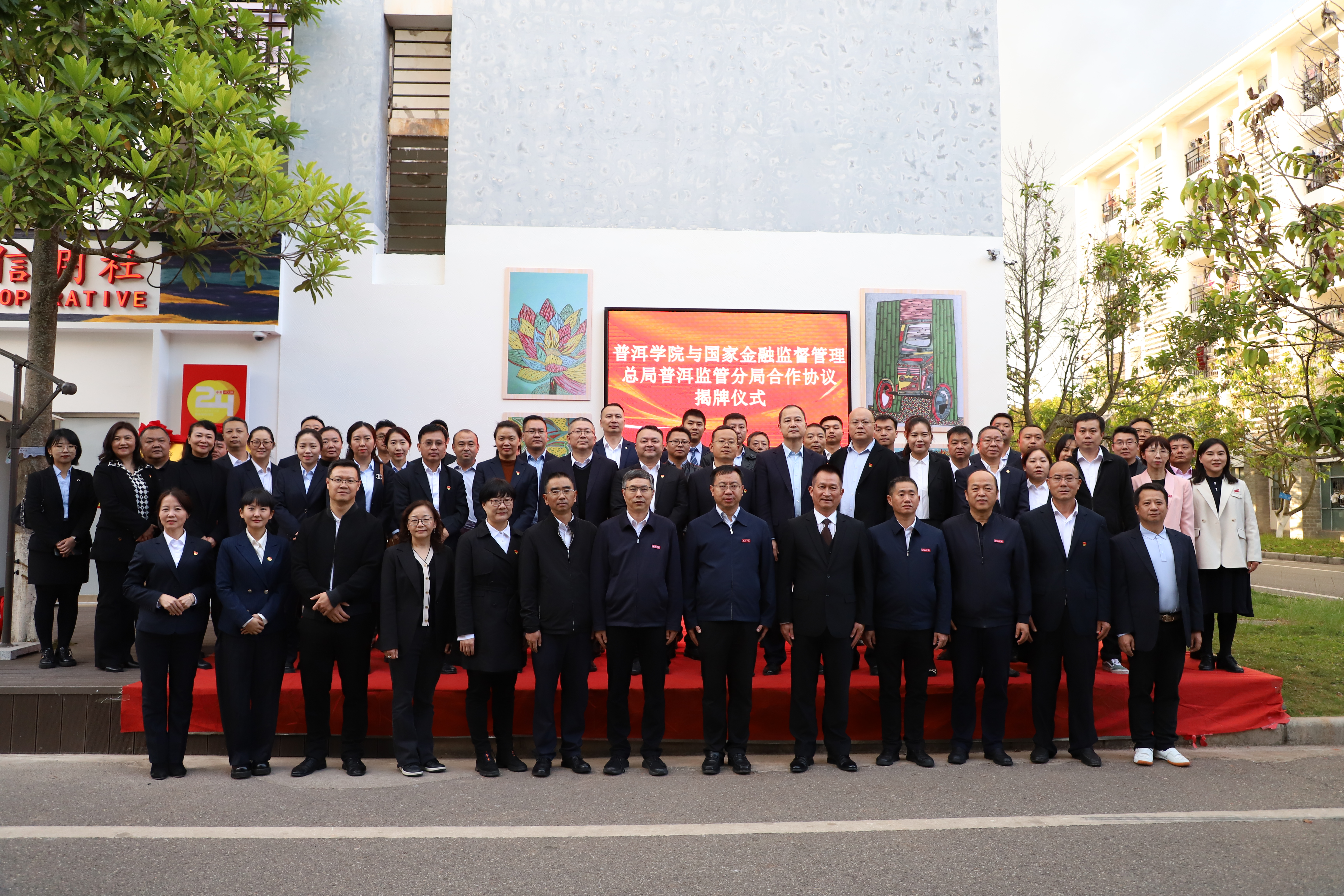 12月21日,普洱学院与国家金融监督管理总局普洱监管分局举行合作协议签约和揭牌仪式。普洱学院党委书记胡国云,党委副书记、院长马文会,党委委员、副院长李祖军,副院长陈勇;普洱市委组织部副部长,市人力资源和社会保障局党组书记、局长曹刚;国家金融监督管理总局普洱监管分局党委书记、局长包宏力。陈勇主持仪式。