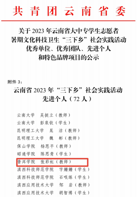 近日,共青团中央发布《关于2023年全国大中专学生志愿者暑期文化科技卫生“三下乡”社会实践活动总结通报》,我院石榴籽队喜获2023年全国大中专学生志愿者暑期文化科技卫生“三下乡”社会实践活动优秀团队荣誉称号。团队前期也成功入选云南省 2023 年“三下乡”社会实践活动优秀团队,指导教师张彩虹获评云南省 2023 年“三下乡”社会实践活动先进个人。