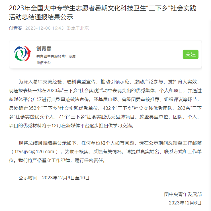 2023年全国大中专学生志愿者暑期文化科技卫生“三下乡”社会实践活动优秀团队