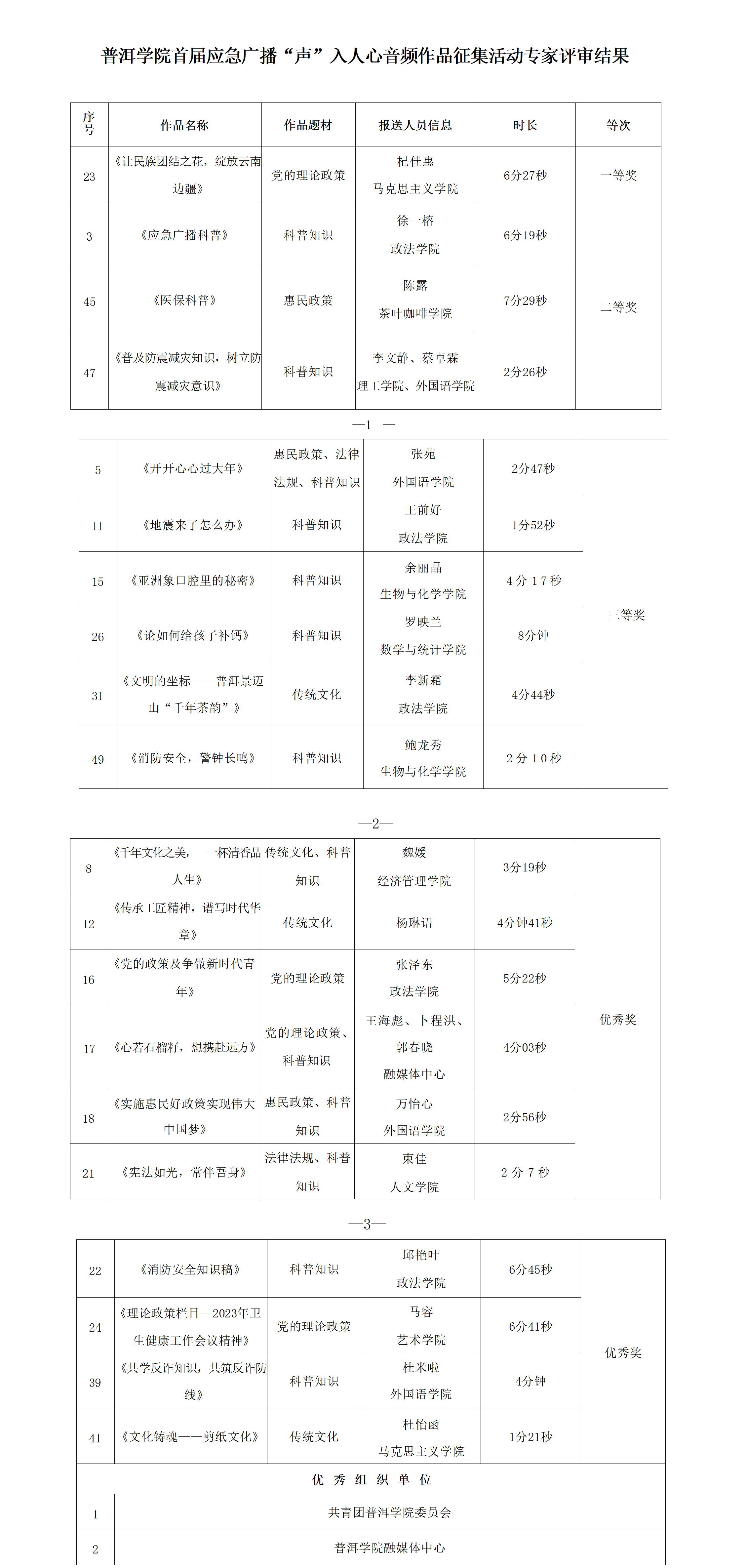 为充分发挥大学社会服务职能作用,激励、引导普院青年积极投身志愿服务活动,将服务社会与普院青年的发展成才紧密结合起来,广泛动员普院青年结合自身兴趣爱好、发挥优势特长,创作推出一批真正贴近人民群众生产生活、接地气有温度的优质应急广播音频作品,展现新时代青年担当。普洱学院、普洱市广播电视局、普洱市志愿服务联合会共同举办应急广播“声”入人心音频作品征集活动,向全校征集应急广播作品。活动期间,广大普院青年积极参与,从独特的视角和理解出发,将创意和知识有机结合,共征集到音频作品共50份,并组织邀请普洱市广播电视局、普洱学院等相关专业行业老师组成专业评审团队,对所有征集的作品分别进行评选评审流程,共评选出一等奖1名,二等奖3名,三等奖6名,优秀奖10名。