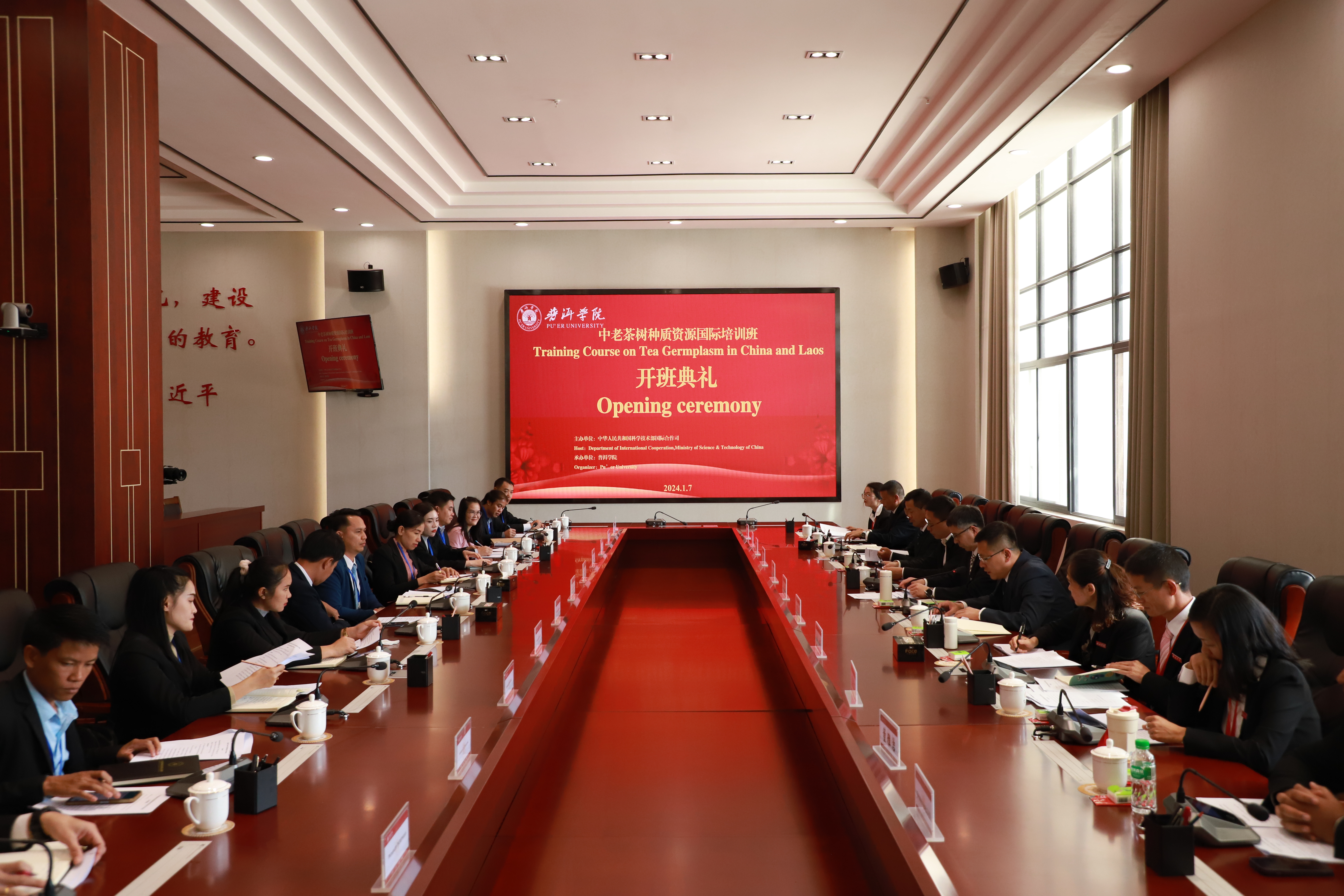 1月7日下午,中老茶树种质资源国际培训班开班典礼在普洱学院举行。普洱学院党委副书记、院长马文会出席并致辞。普洱学院党委委员、副院长田洋主持开班典礼,普洱市科技局局长严亮以及老挝学员出席开班典礼。