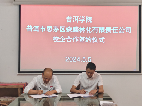5月5日下午,普洱学院与普洱市思茅区森盛林化有限责任公司正式签订校企合作协议。普洱学院副院长陈勇;森盛林化公司有限责任公司党支部书记、总经理李海兵,常务副总经理冯盛,副总经理杨冬出席签约仪式。