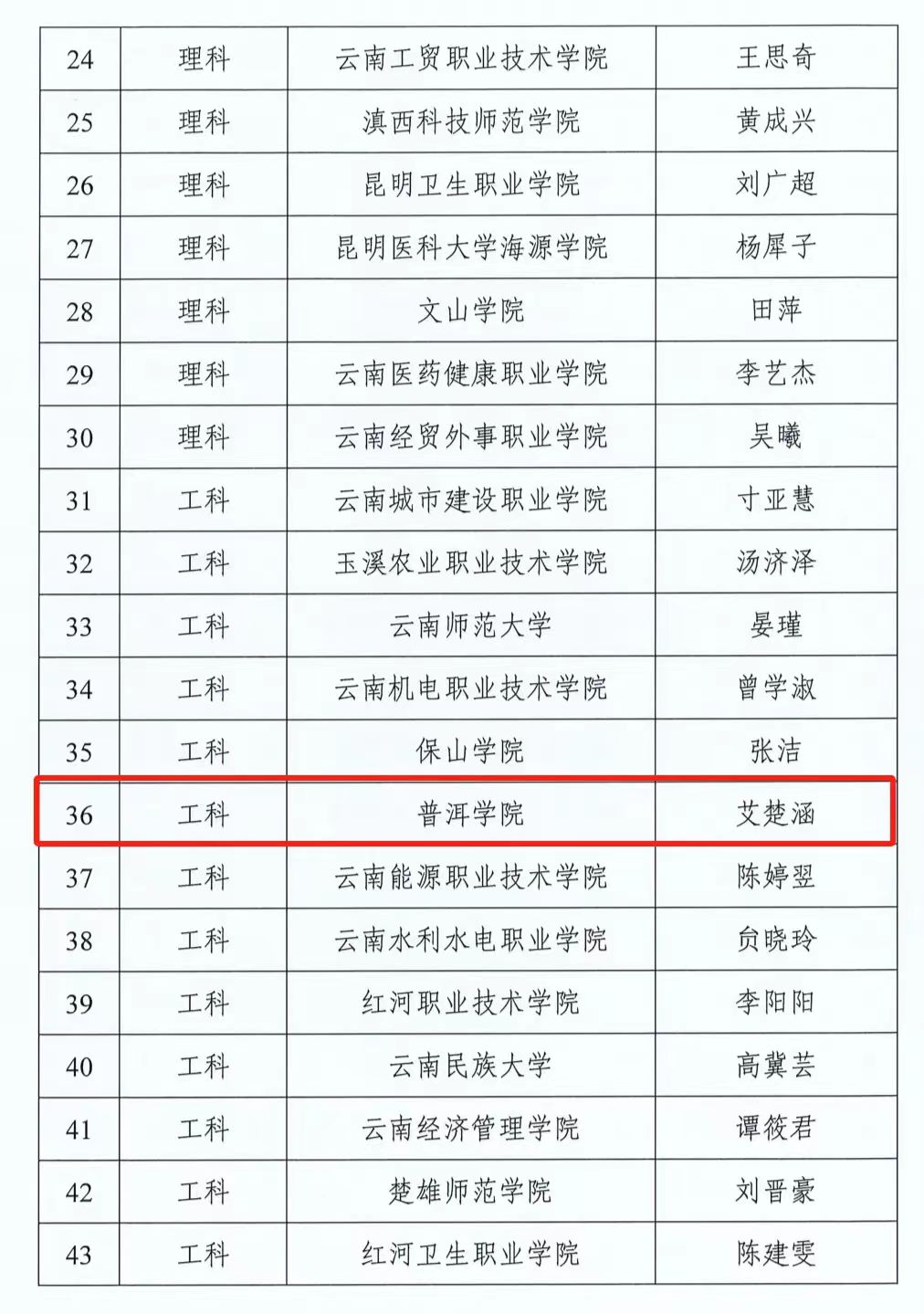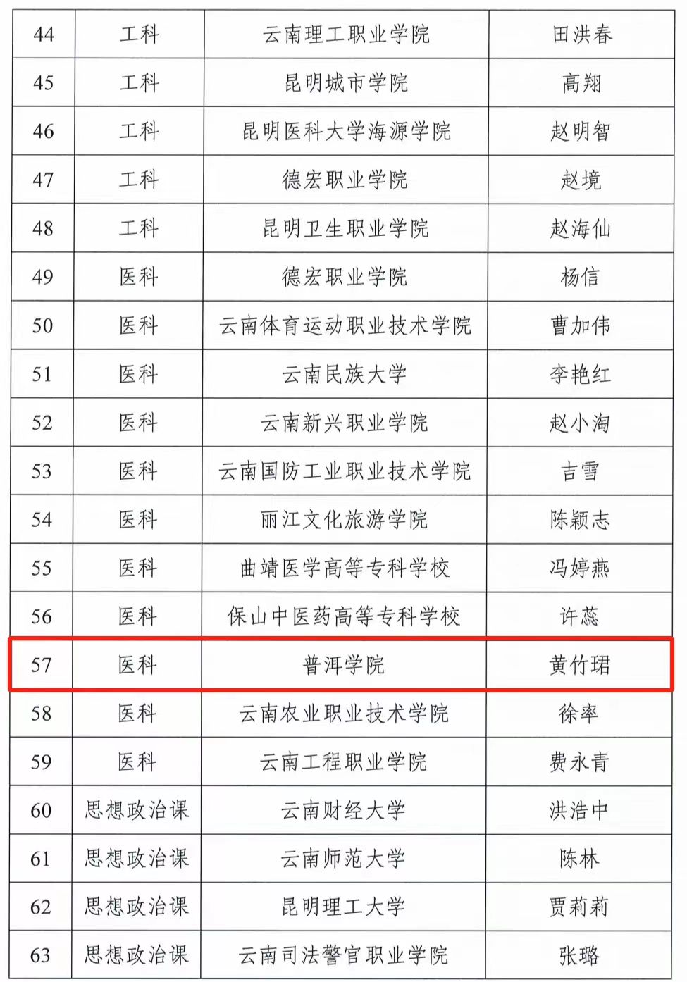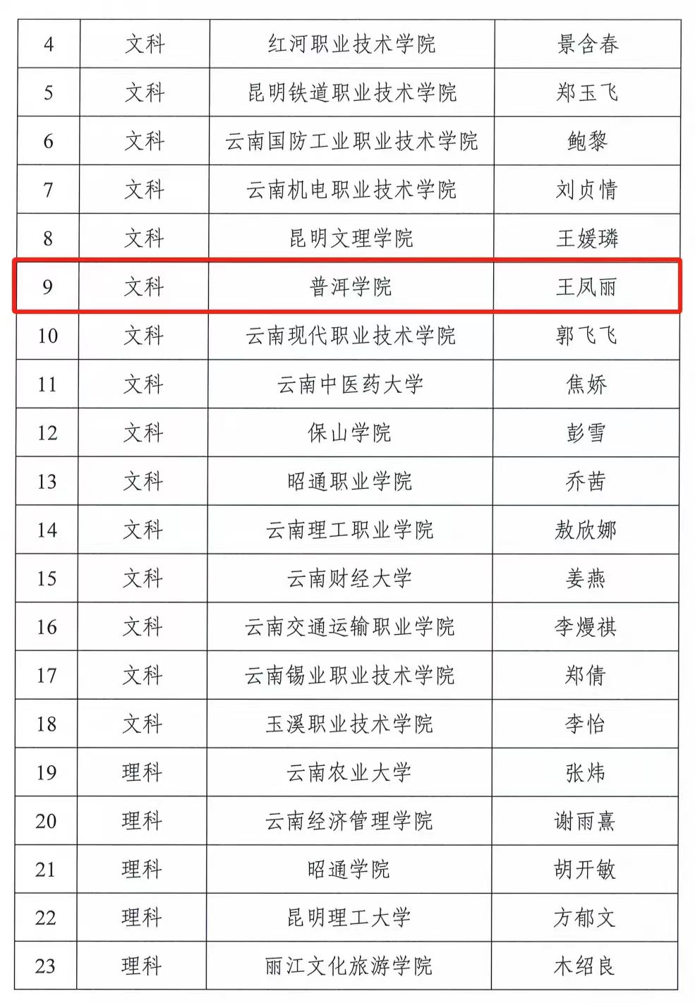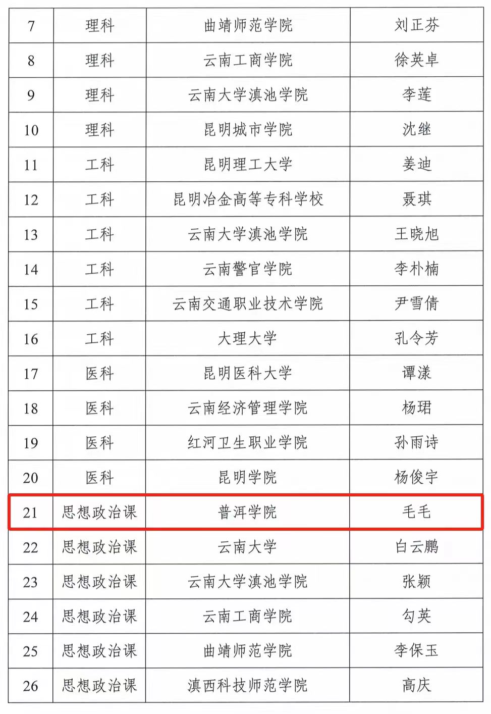 据7月22日云南省总工会、云南省教育厅印发《关于公布第一届云南省高校青年教师教学竞赛获奖名单的通知》,普洱学院教师毛毛荣获思想政治课组别一等奖,王凤丽荣获文科组别三等奖,艾楚涵荣获工科组别三等奖,黄竹珺荣获医科组别三等奖。