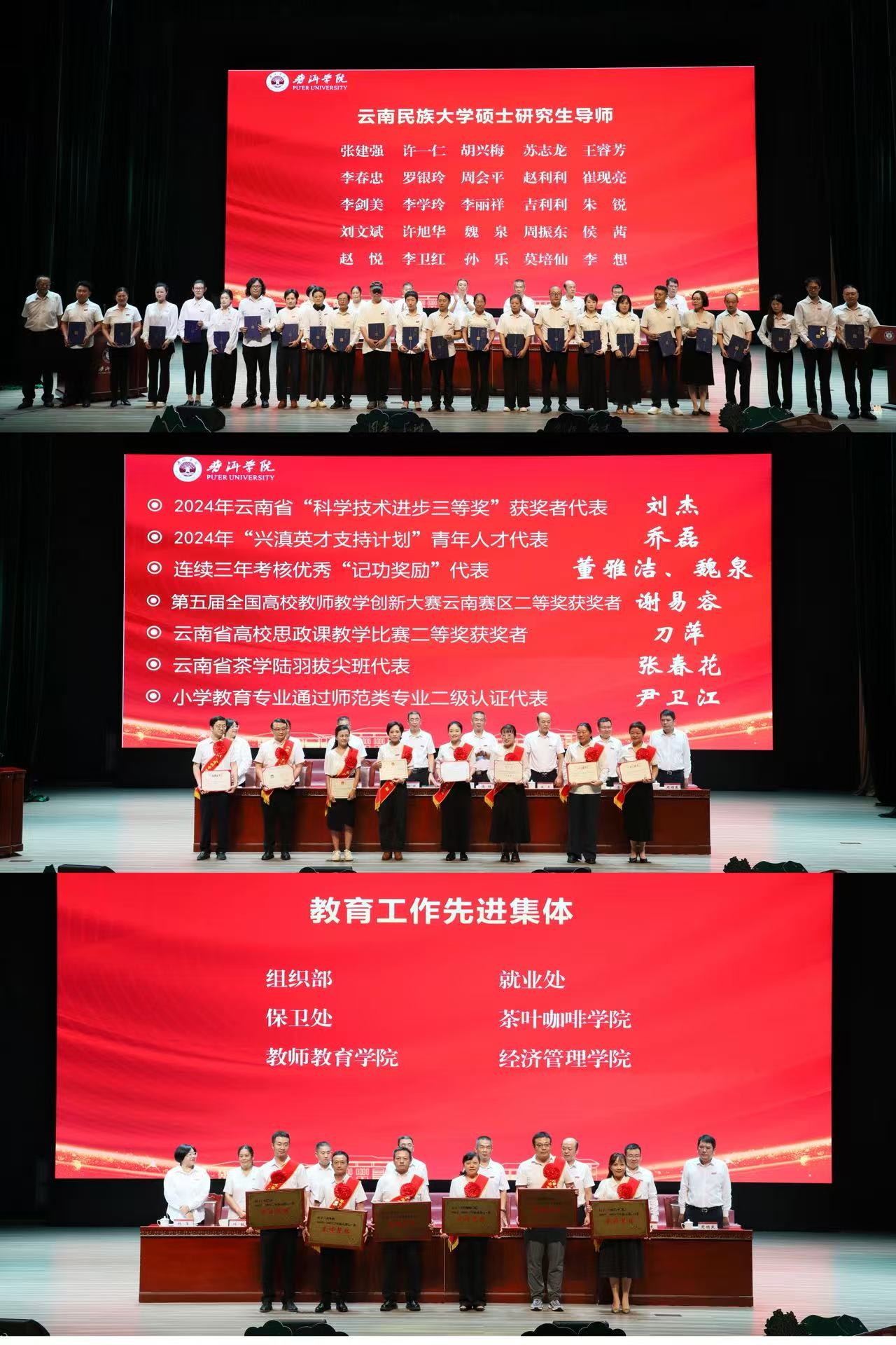 会上表彰了2024、2025学年省级以上奖励获奖者和普洱学院2024年—2025学年教育工作先进集体、优秀教师、优秀教育工作者、最美教师、服务之星;获表彰集体和代表分别作了交流发言。