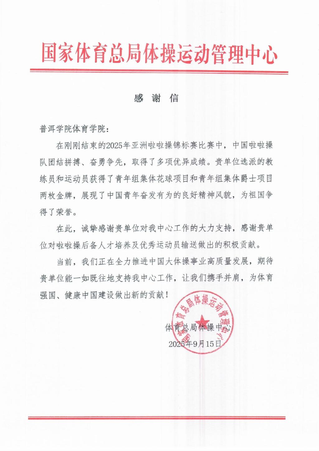 近日,普洱学院收到国家体育总局体操运动管理中心发来的感谢信,对学校在2025 年亚洲啦啦操锦标赛中的突出贡献给予高度肯定与诚挚感谢。