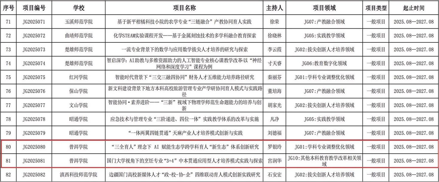 近日,云南省教育厅公布2025年本科高校教育教学改革研究项目立项结果,普洱学院罗银玲老师主持的《“三全育人”理念下 AI 赋能生态学跨学科育人“新生态”体系创新研究》与宫润华老师主持的《国门大学视角下的烹饪专业“3+4”中本贯通应用型人才培养模式实践与探索》项目成功获批立项,彰显了学校在教育教学改革领域的积极探索与显著成效。