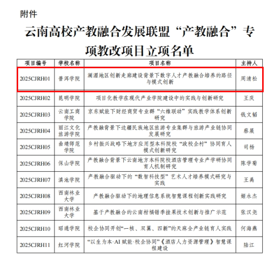 近日,云南高校产教融合发展联盟正式公布《2025 年产教融合专项教改项目立项名单》,普洱学院申报的项目《澜湄地区创新走廊建设背景下数字人才产数融合培养的路径与模式创新》(项目编号:2025CJRH01)凭借鲜明的特色、扎实的研究基础与深远的应用价值,经自主申报、单位推荐、资格审查及专家组综合评审等多环节严格遴选,成功获批立项,这是学校在产教融合教育教学改革领域取得的又一重要突破。