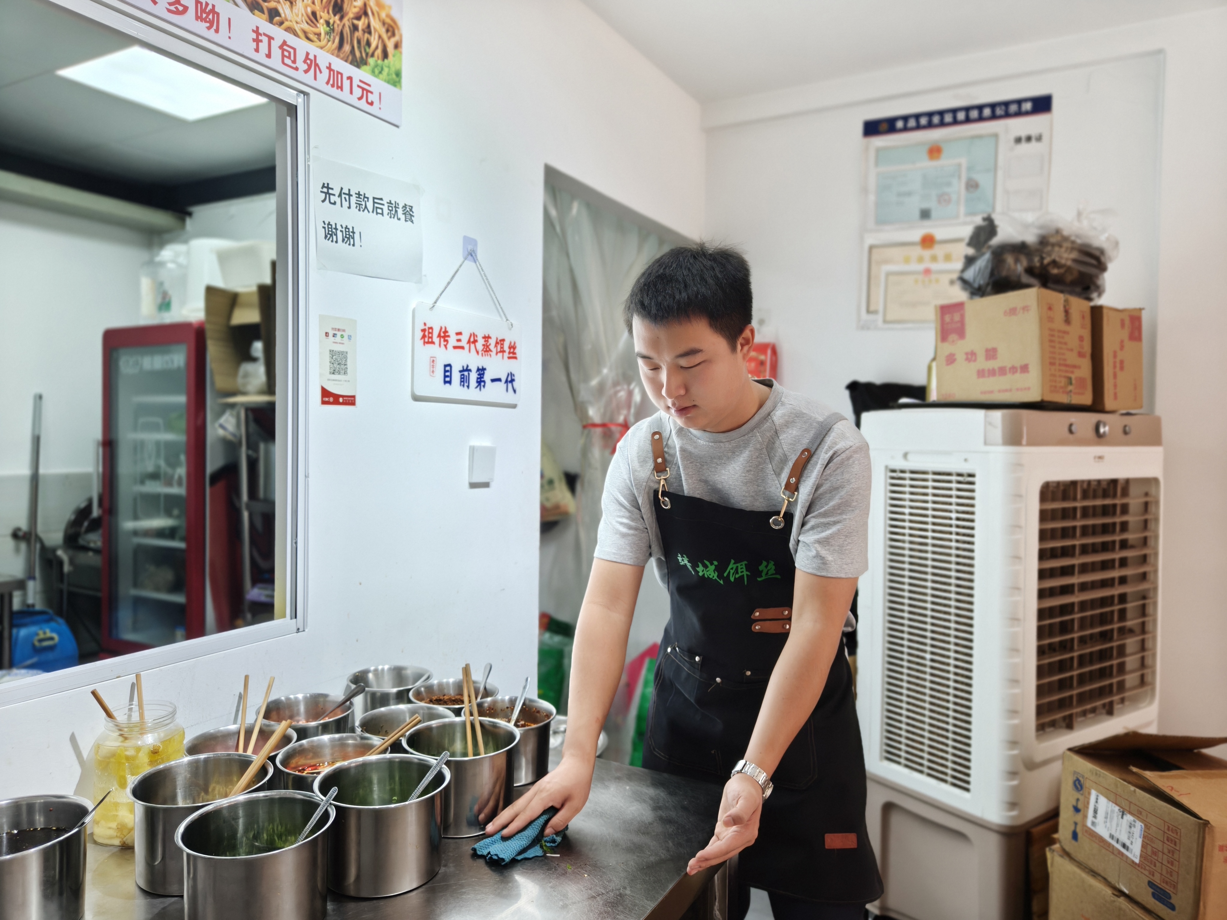 2025年2月,他在普洱永丰坊不夜城开设“靖城饵丝店”,将家乡曲靖的非遗美食“蒸饵丝”引入普洱。为还原地道风味,他三赴曲靖拜师老厨,反复调试米浆配比与酱料配方。“学员练车耗体力,一碗热饵丝既能当早餐也能当午餐;晚上这里夜经济活跃,还能吸引市民打卡。”如今,小店日均接待学员及食客超200人次,成为连接“学车场景”与“城市烟火气”的纽带。