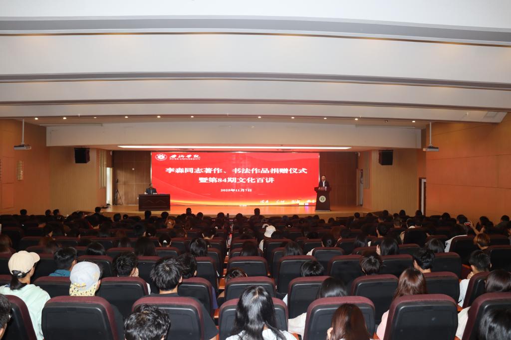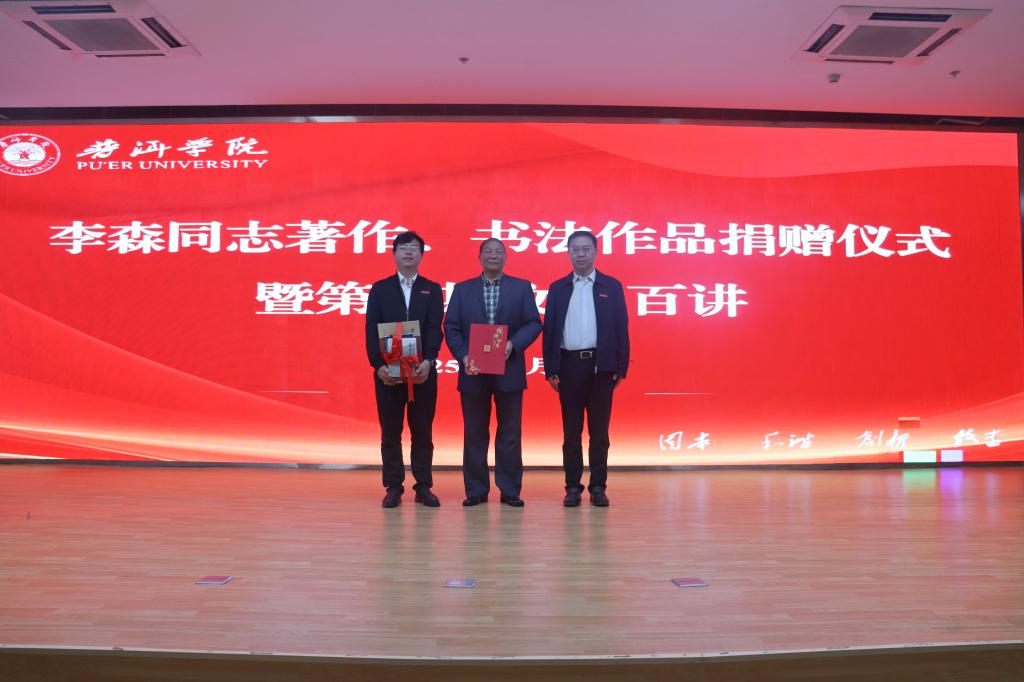 11月7日,普洱学院在图书馆报告厅举行李森同志书法作品及著作捐赠仪式,并同步开展“文化百讲”第84讲。省委原副秘书长、省委政策研究室原主任李森应邀出席并主讲,党委书记胡国云主持。党委班子成员、关工委成员,银龄教师及师生代表等参加。
