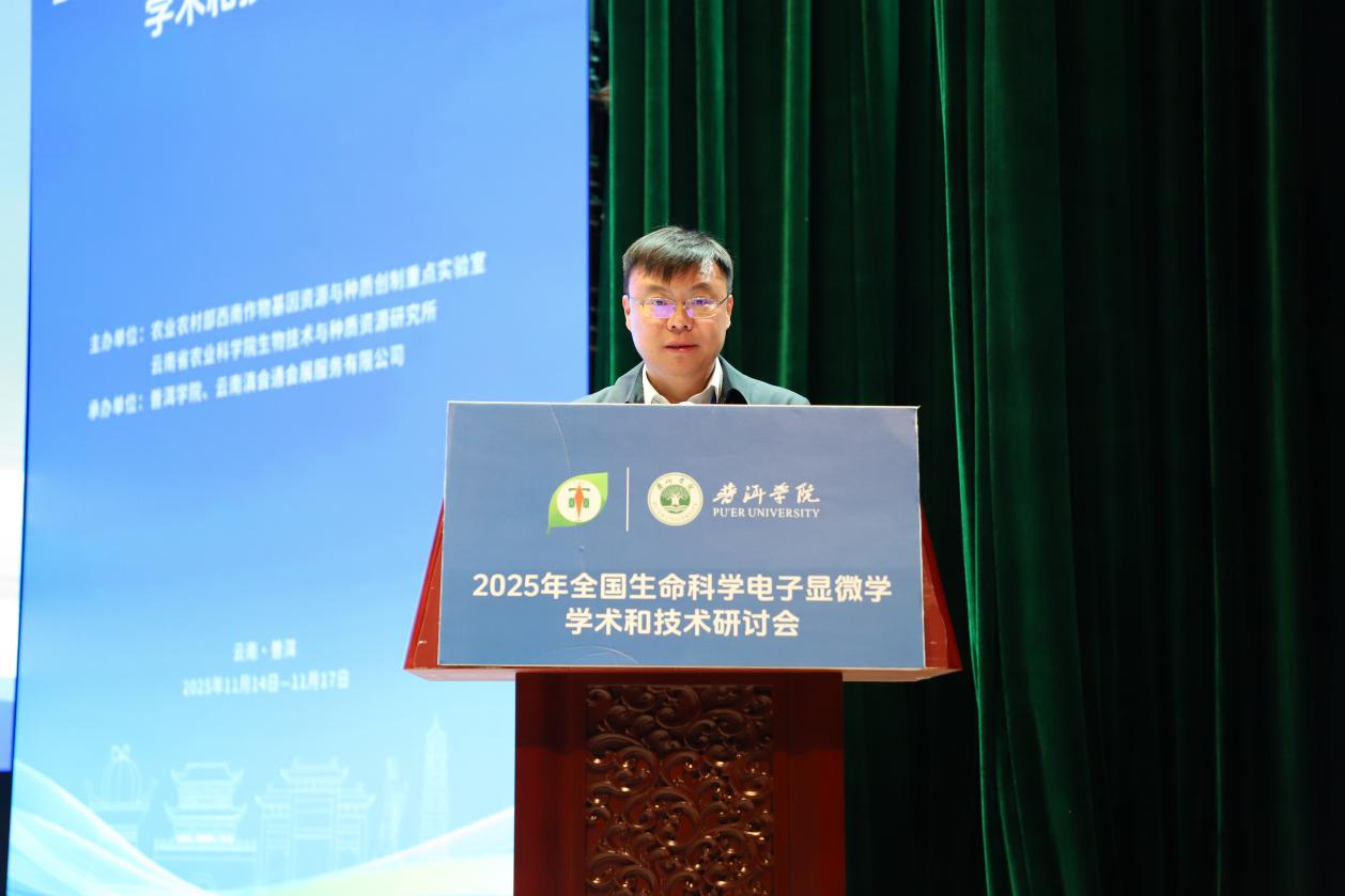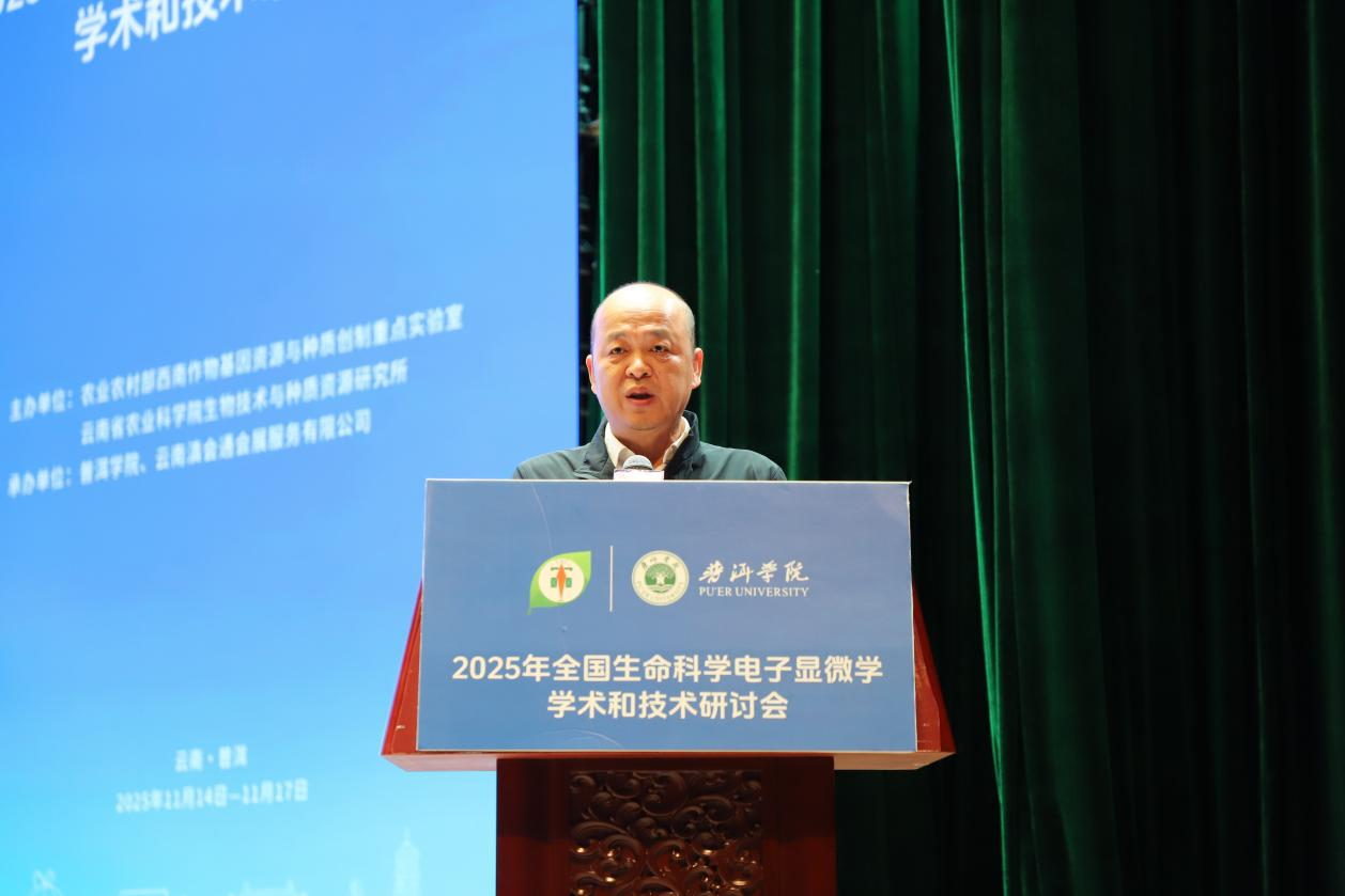 胡强代表云南省农业科学院对会议的召开表示祝贺。他指出,此次研讨会聚焦生命科学电子显微学技术前沿,开展广泛且深入的学术研讨,共同探索领域发展方向,是云南省农业科学院贯彻落实党的二十届四中全会关于加快高水平科技自立自强要求的重要举措。期待以此次会议为契机,积极学习借鉴各方先进经验,深化与各单位的合作,不断提升生命科学电子显微学的研究应用水平,产出更多合作成果,为培育农业新质生产力注入强劲动力。
