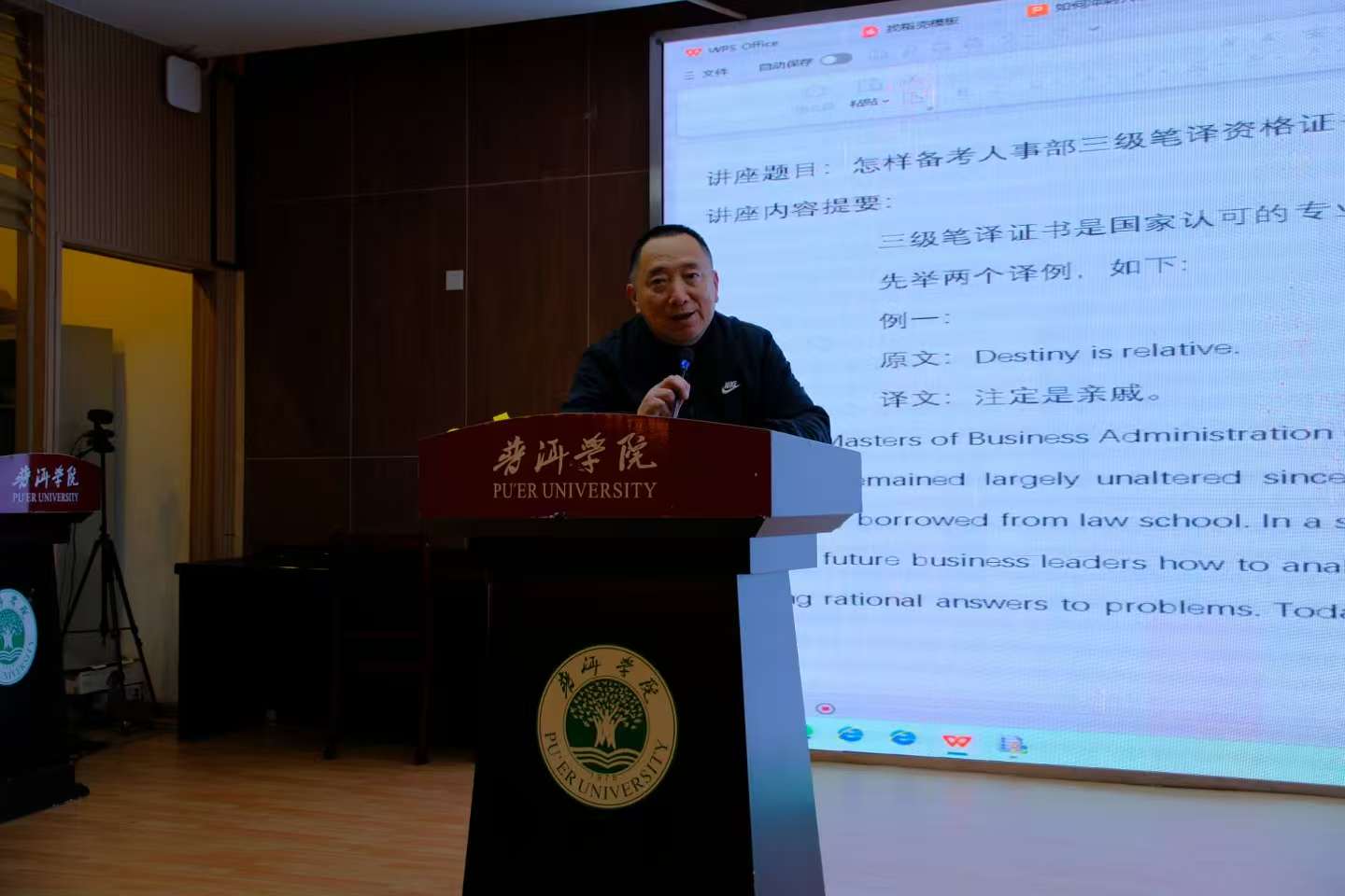 11月27日晚,普洱学院举办文化百讲第88讲,邀请中国翻译协会专家会员王维东老师进校,作题为《如何冲刺人事部三级笔译资格证书考试》的专题讲座,聚焦全国翻译专业资格(CATTI)三级笔译考试备考,为外国语学院师生代表送上实用攻略。