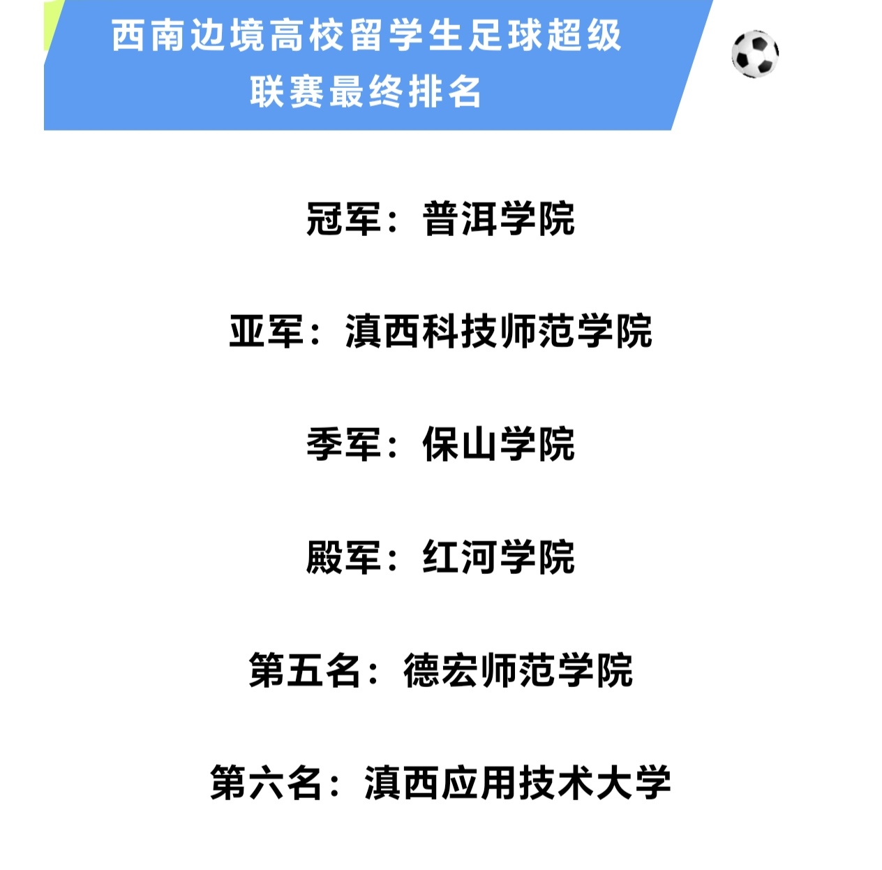 2025年11月27日至29日,“首届西南边境国门高校留学生足球超级联赛”在滇西科技师范学院举办,普洱学院代表队勇夺冠军,老挝留学生王宁同学获得“最佳门将”。
