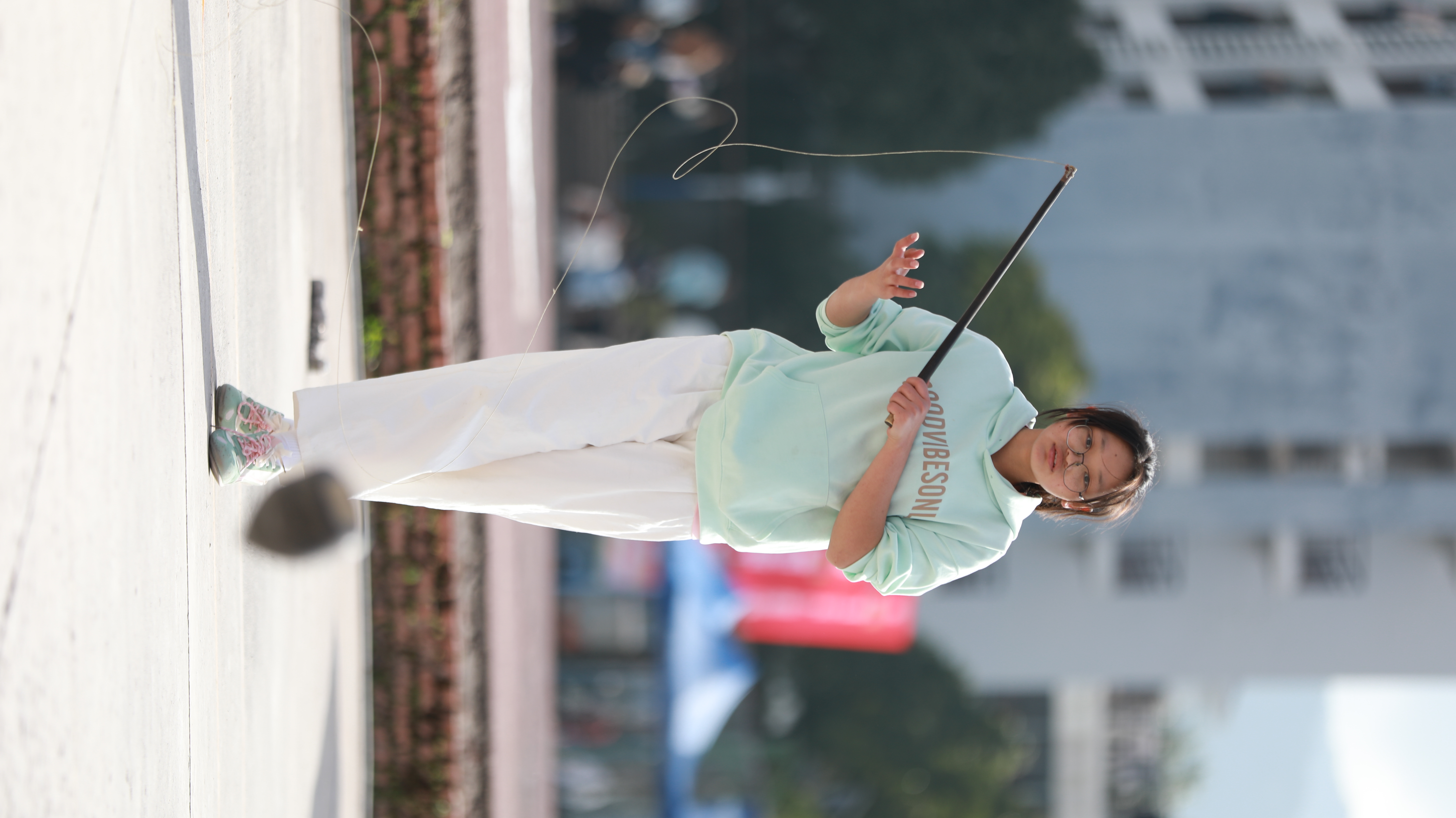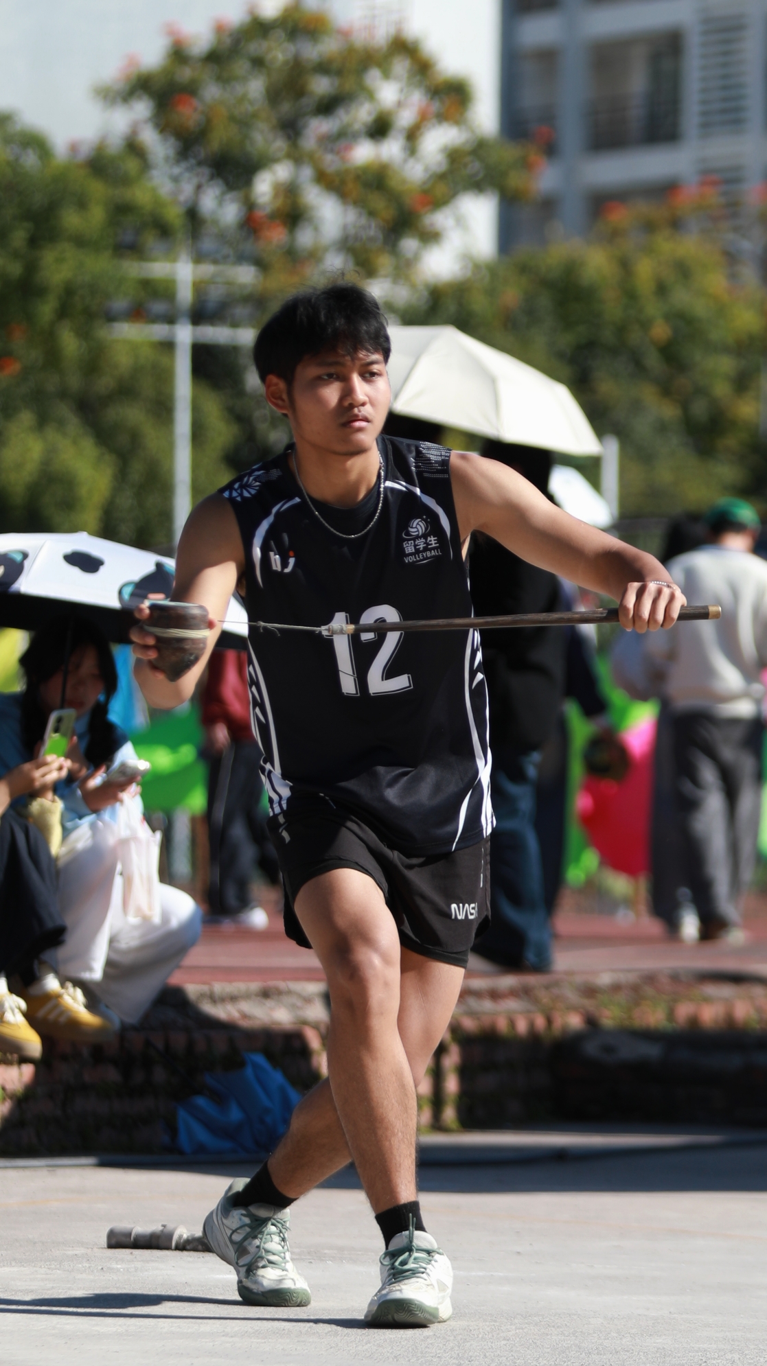 旋转飞扬,是陀螺赛场的独特风景。抽绳、放陀、抽打,小小的陀螺在选手的操控下飞速旋转,稳稳立于地面。选手们眼疾手快,手中的鞭子精准落下,陀螺旋转的嗡嗡声与赛场的欢笑声交织,传统项目在校园里焕发出别样的活力。