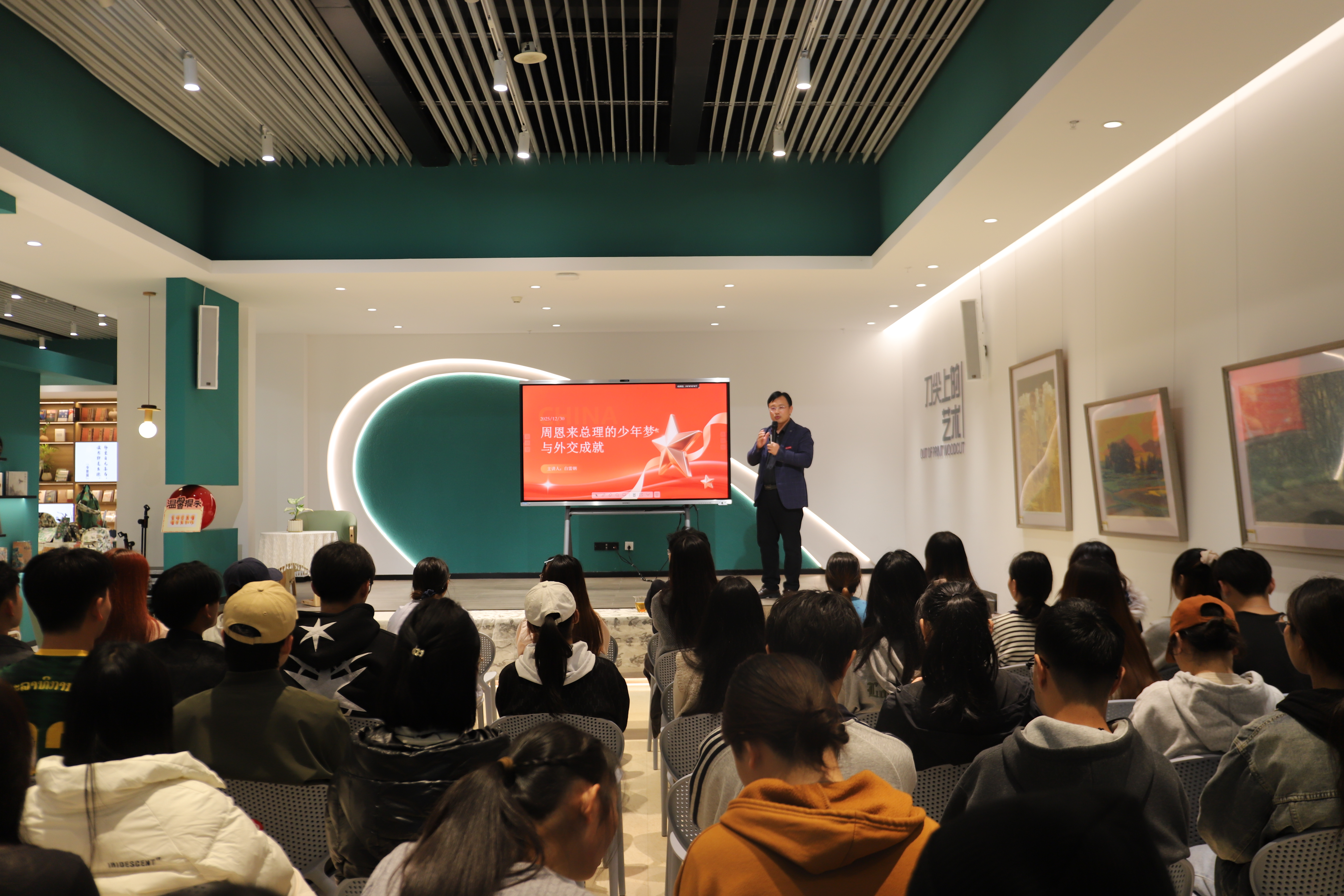 在专题讲座“周恩来总理的少年梦和外交成就”中,主讲人围绕周恩来总理的早年经历与外交生涯展开深入讲解,以生动的叙事、翔实的案例,深入解读了周恩来总理少年时期立下“为中华之崛起而读书”壮志的时代背景与初心使命,细致讲述了他在日内瓦会议、万隆会议等重大外交场合的卓越表现,周恩来总理提出的和平共处五项原则、“求同存异”方针等重要理念,不仅为新中国奠定了坚实的国际地位,更彰显了大国风范,让师生们对伟人的思想境界与历史贡献有了更为全面深刻的体悟。