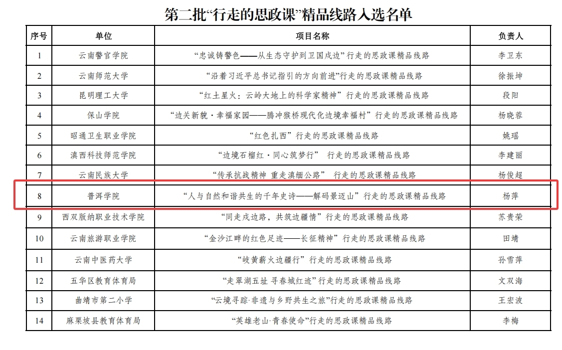 普洱学院入选项目涵盖“行走的思政课”精品线路、“一体化实践教学中心”、思政课优秀教案、思政课精品课4个类别。入选项目分别为:杨萍老师团队的《“人与自然和谐共生的千年史诗——解码景迈山”行走的思政课精品线路》、庄桂花老师团队的《“丰碑·同心”大中小幼铸牢中华民族共同体意识教育一体化实践教学中心》、李晓芳老师的优秀教案《誓词碑下石榴花开民族团结籽籽同心》以及毛毛老师的精品课《如何认识资本的秘密?》。
