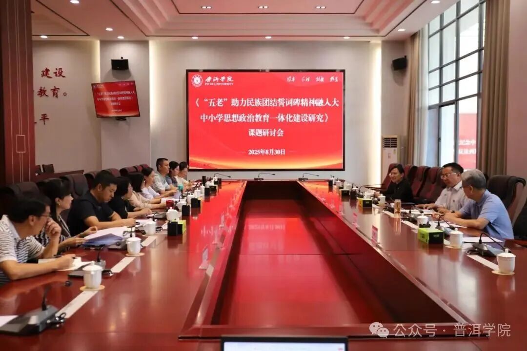 8月30日,普洱学院在图书馆一楼会议室举行《“五老”助力民族团结誓词碑精神融入大中小学思想政治教育一体化建设研究》课题研讨会。普洱学院党委书记胡国云,云南省教育厅关心下一代工作委员会常务副主任刘沧山、副秘书长吕志雄,相关校外专家及课题组成员参加。普洱学院党委副书记吴琳主持。